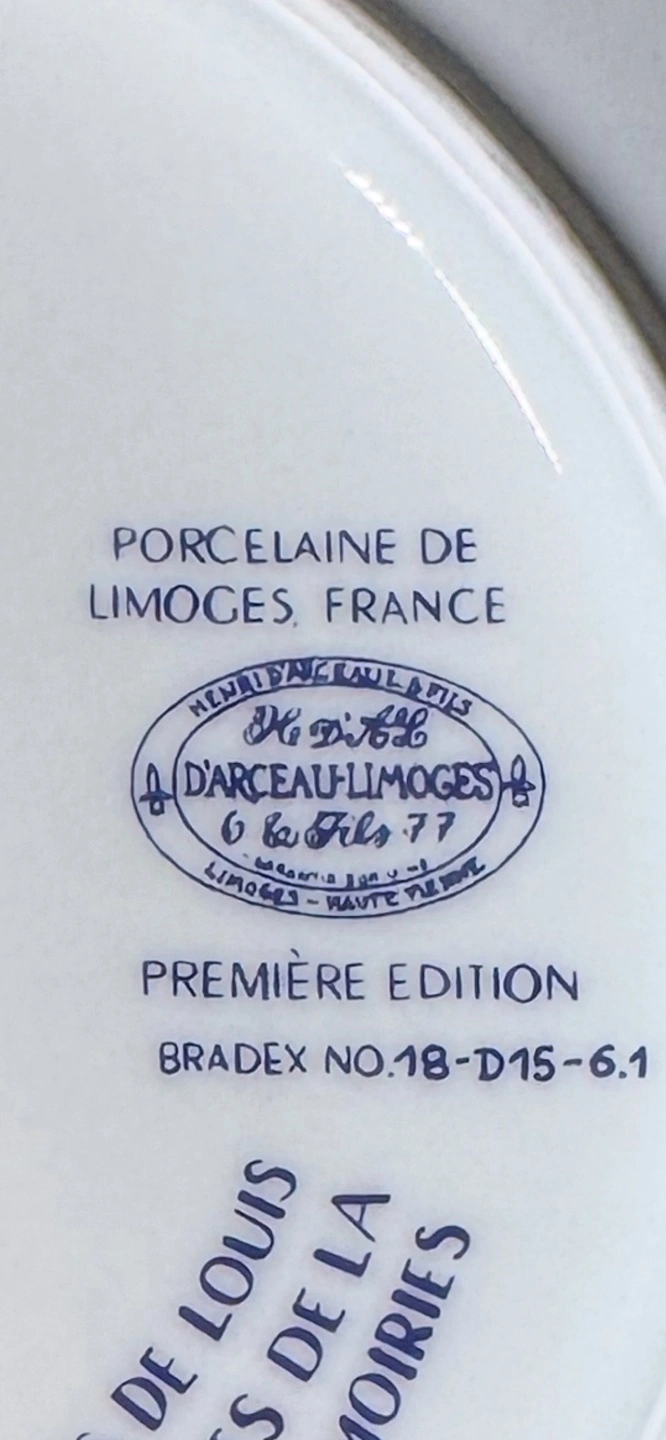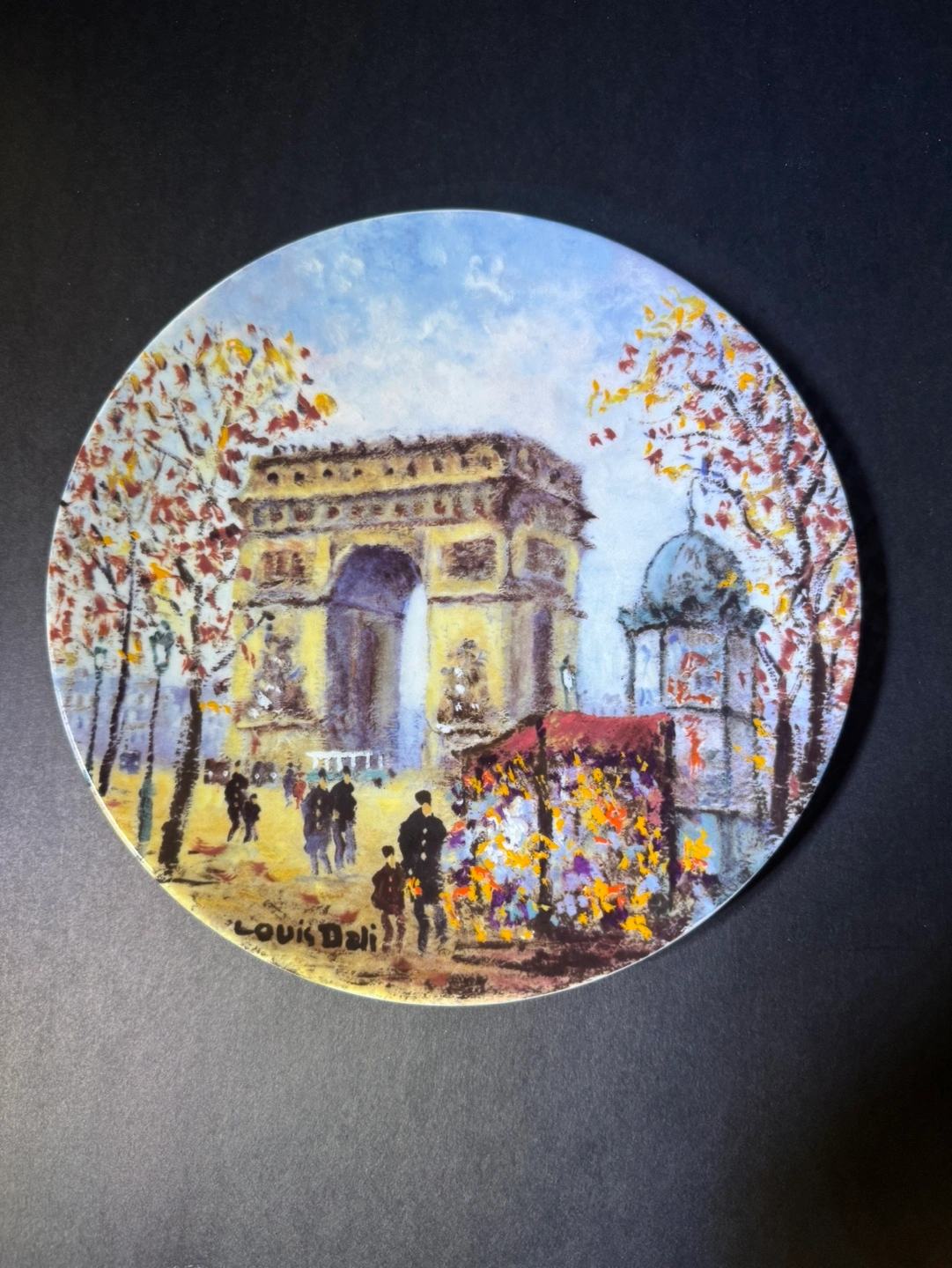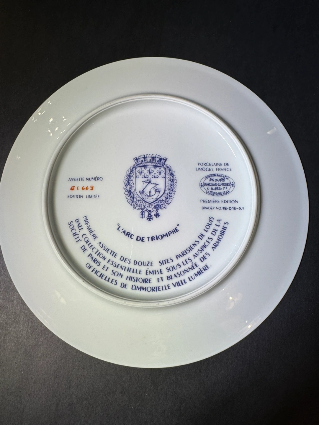 Collectible porcelain plate. Features an image of the Arc de Triomphe. Limited edition, numbered 61663. Made in Limoges, France. Part of the Premiere Collection. Diameter 21cm
