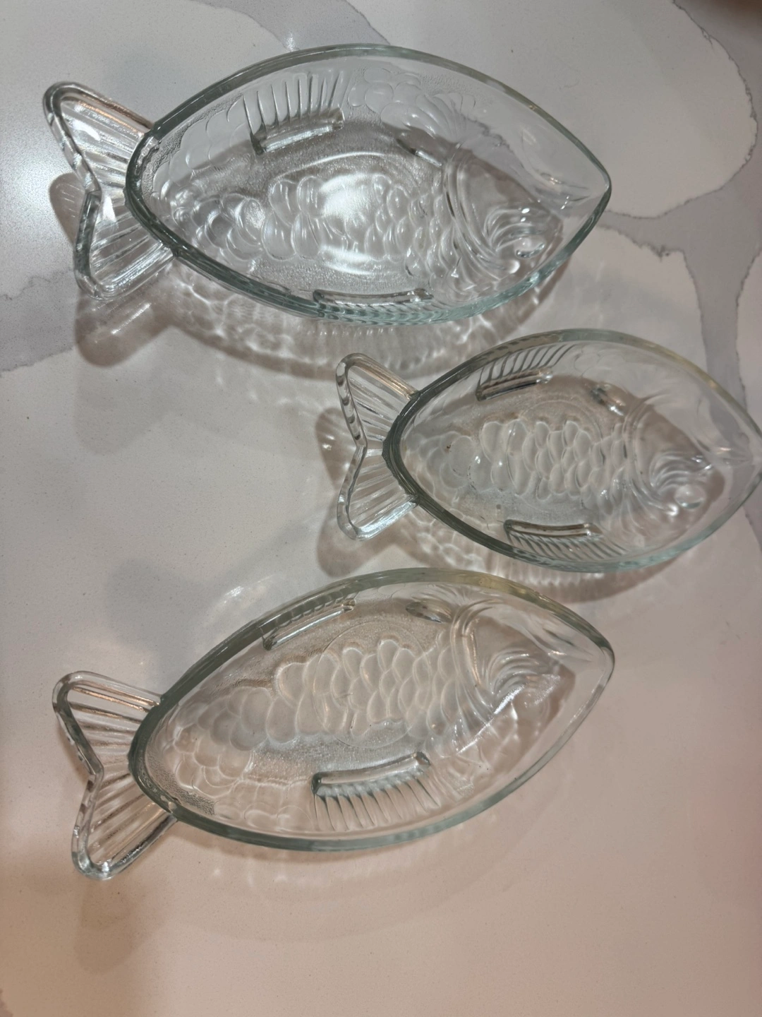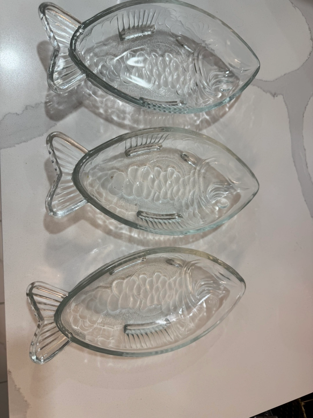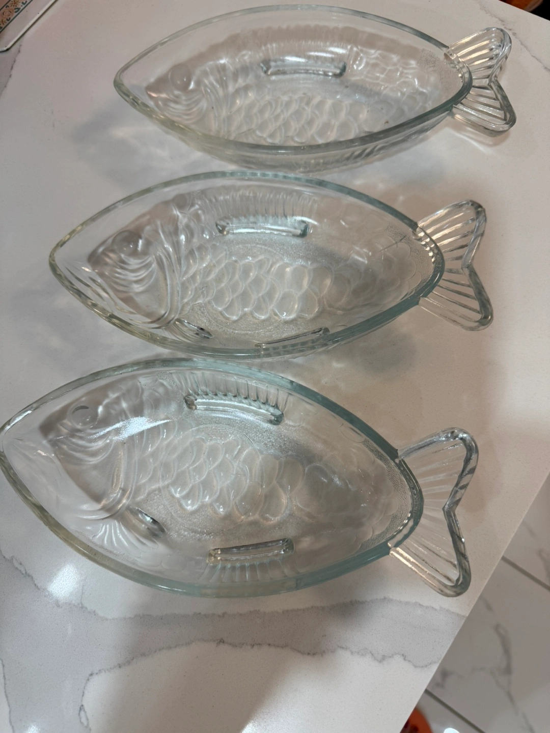 Three clear glass dishes. Shaped like fish. Approximately 9 inches long. Perfect for serving snacks or appetizers. From smoke free, pet free home. Pick up at Steeles/Bathurst , North York.