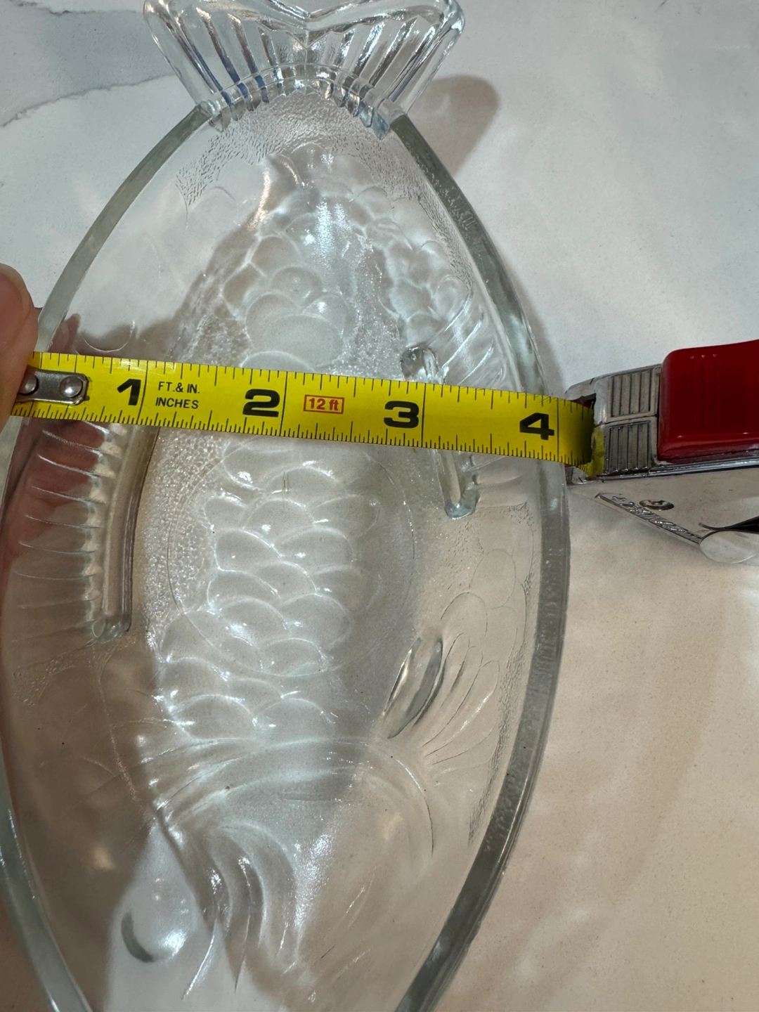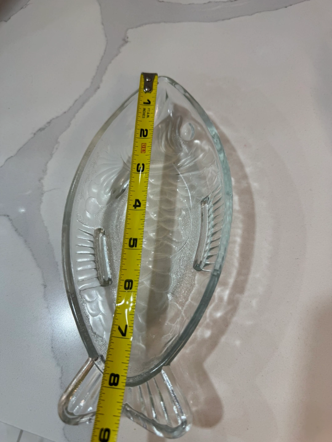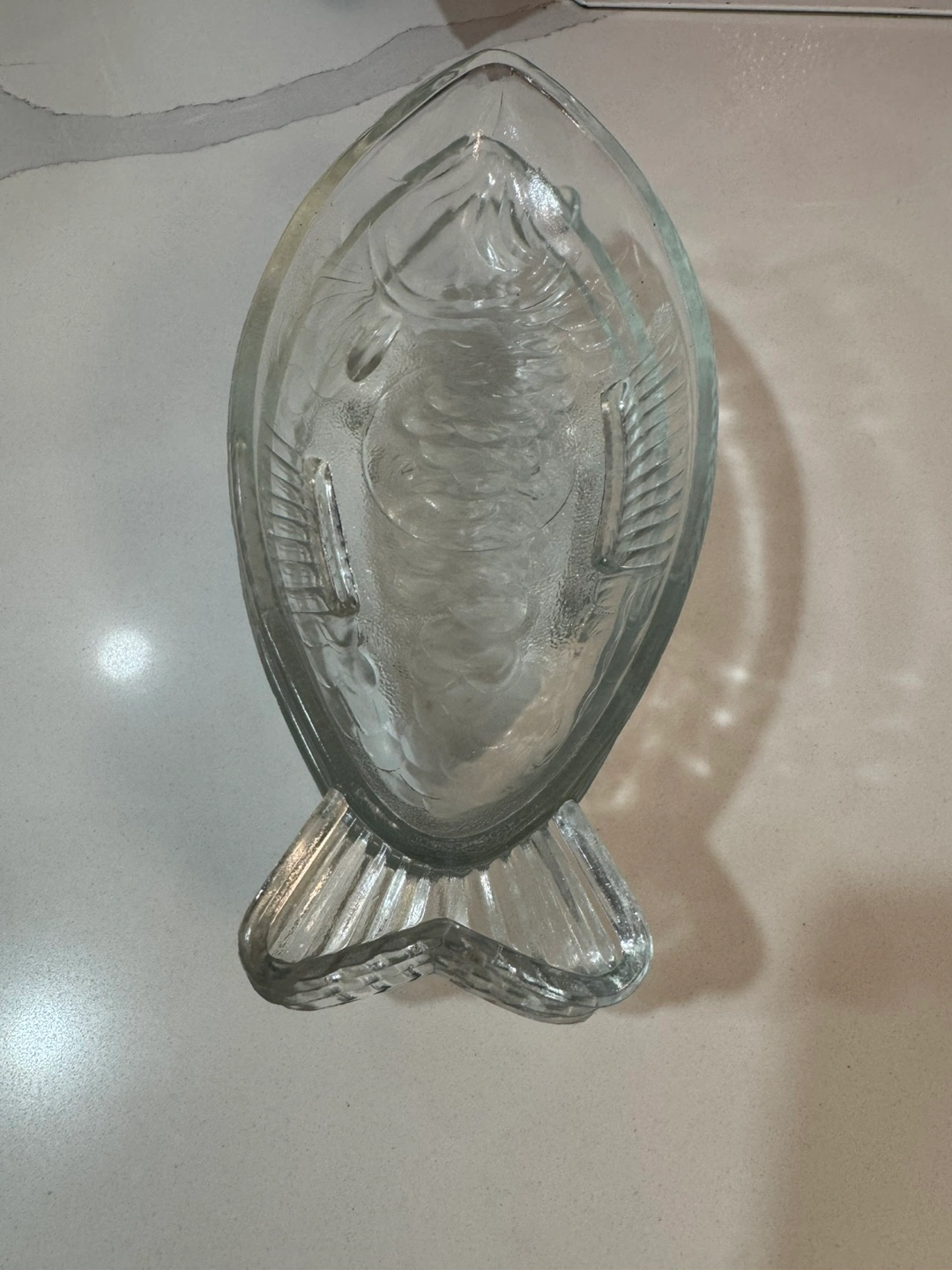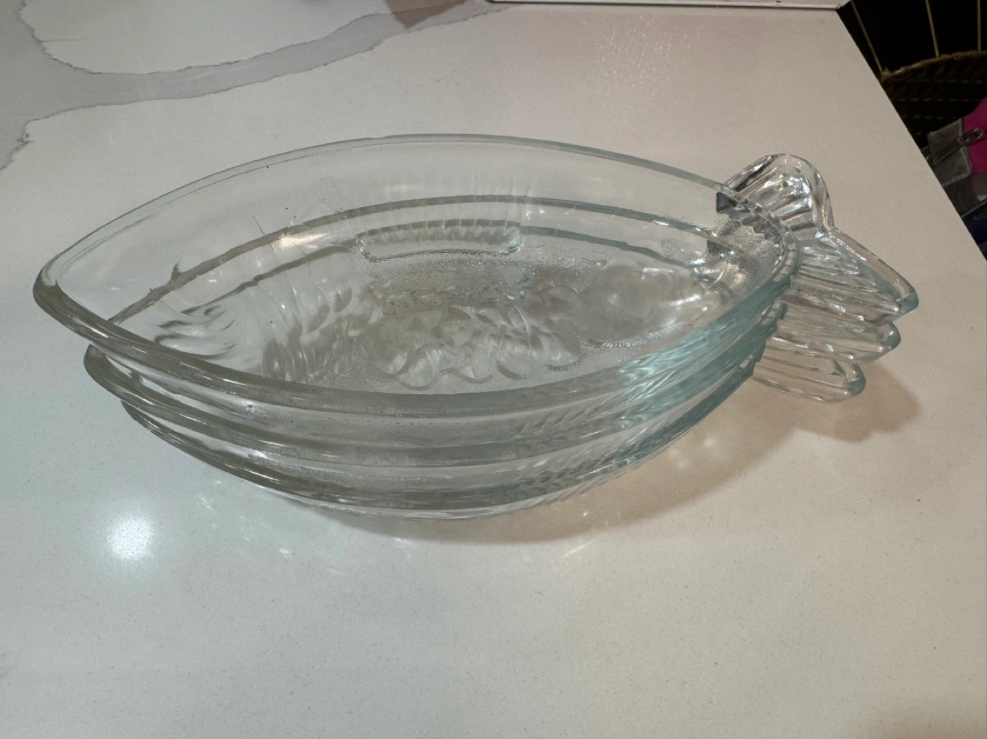 Three clear glass dishes. Shaped like fish. Approximately 9 inches long. Perfect for serving snacks or appetizers. From smoke free, pet free home. Pick up at Steeles/Bathurst , North York.