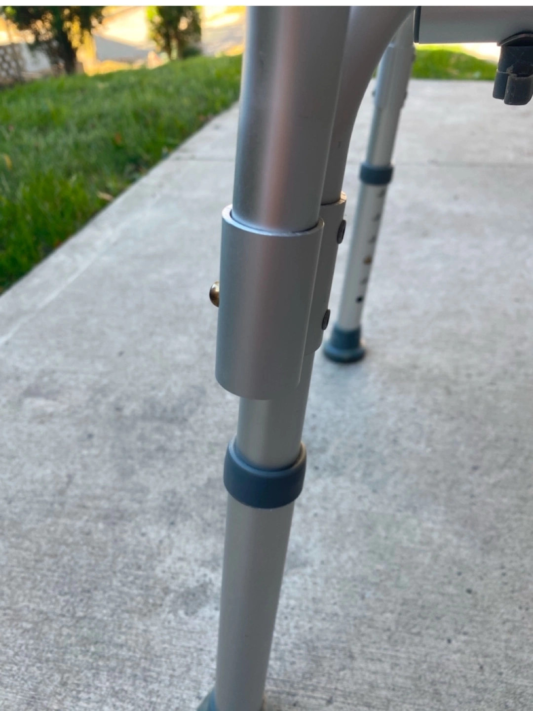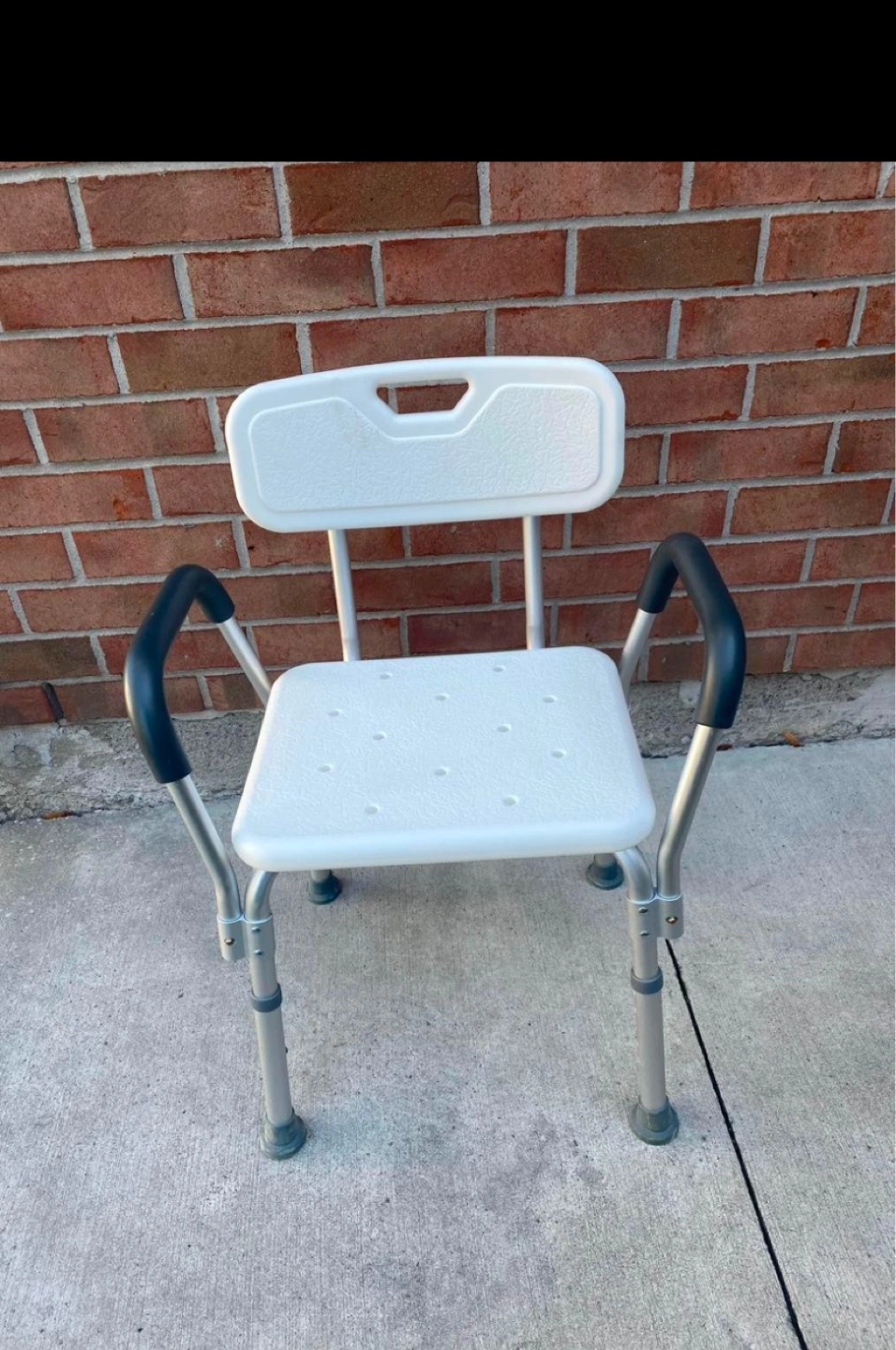 Adjustable height shower chair. Features a backrest and armrests for added support and stability. Durable plastic seat with drainage holes. Lightweight aluminum frame. Easy to clean.
