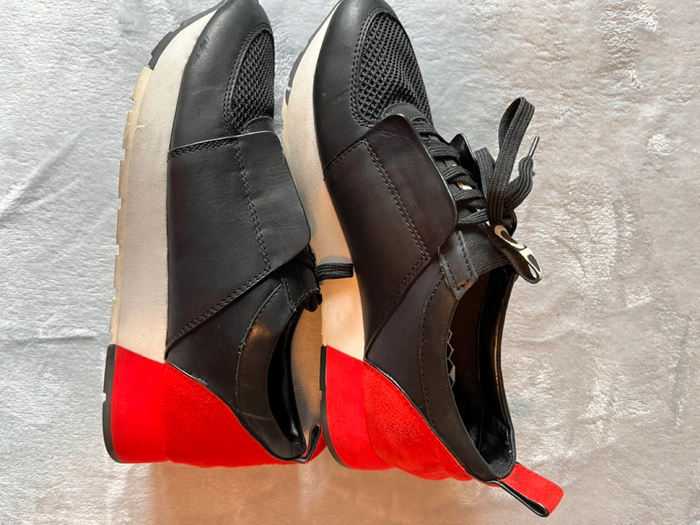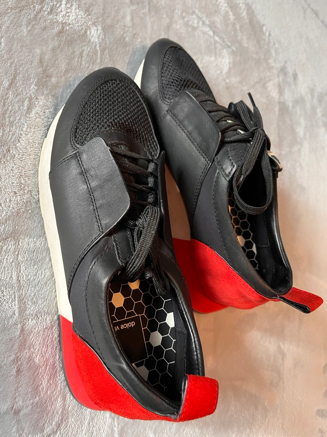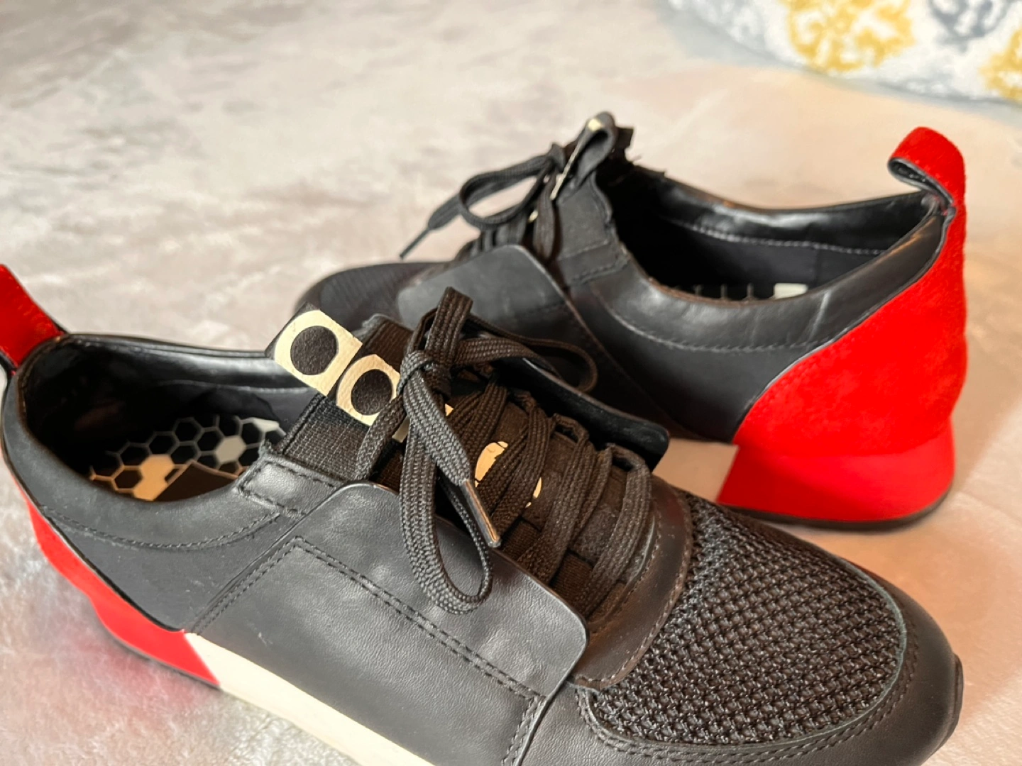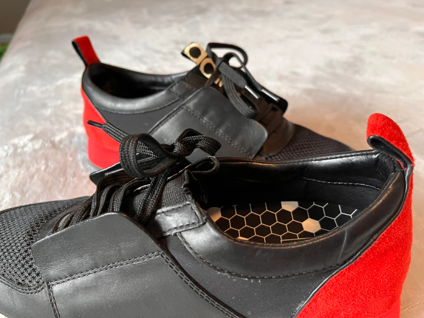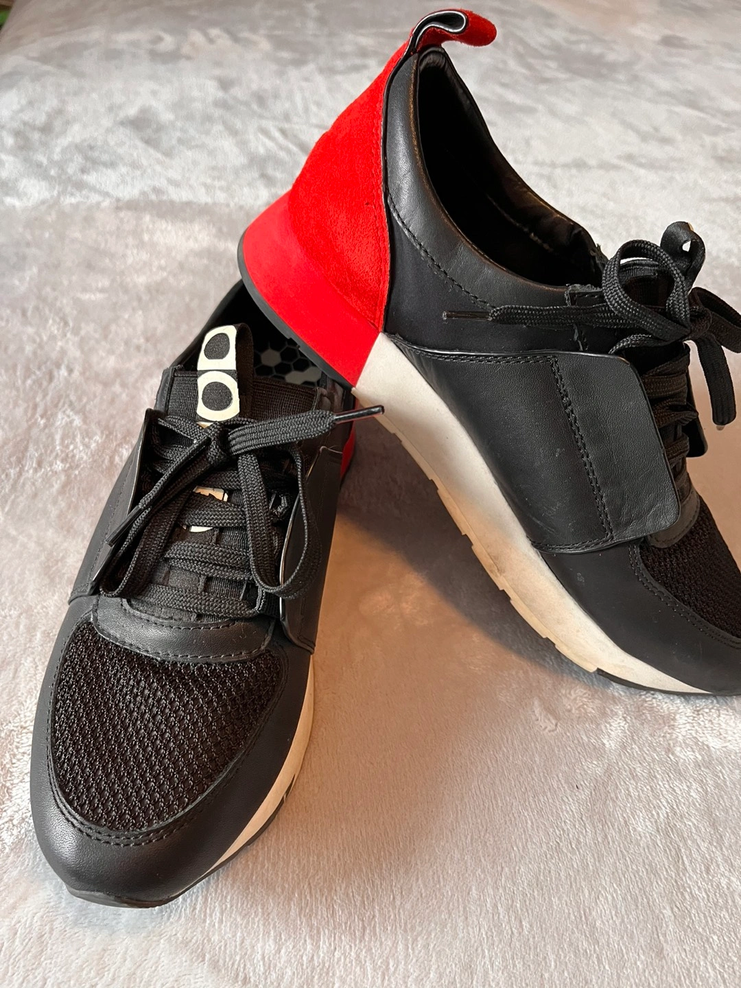 Tri-colour black leather & red suede and white sole. Lightly worn and much loved! Unfortunately they don’t fit after my pregnancy