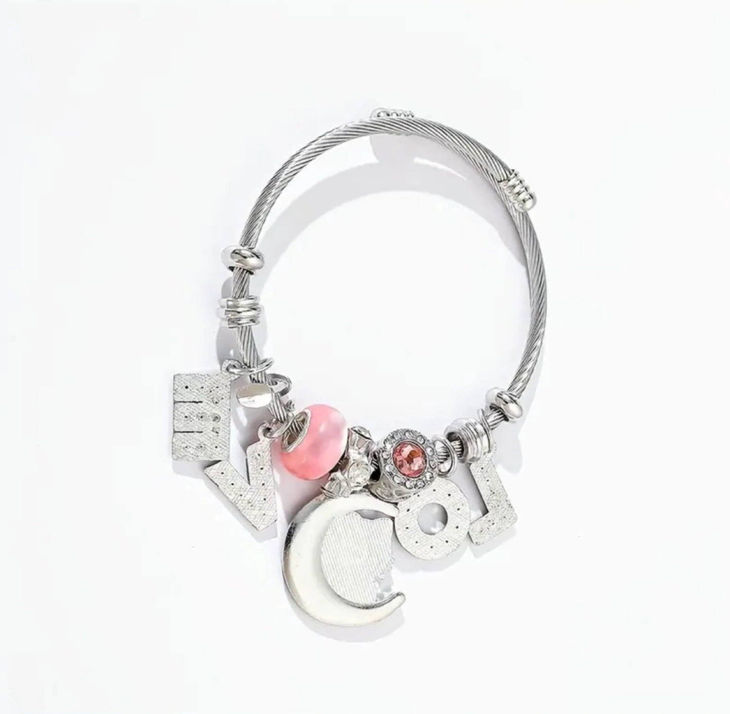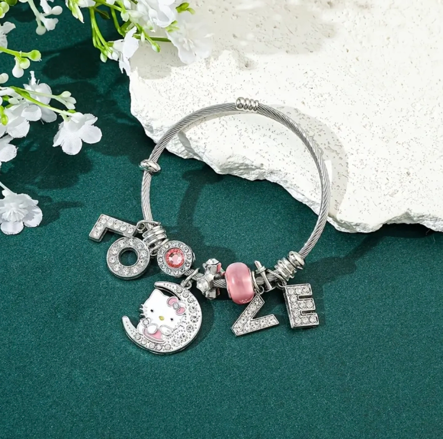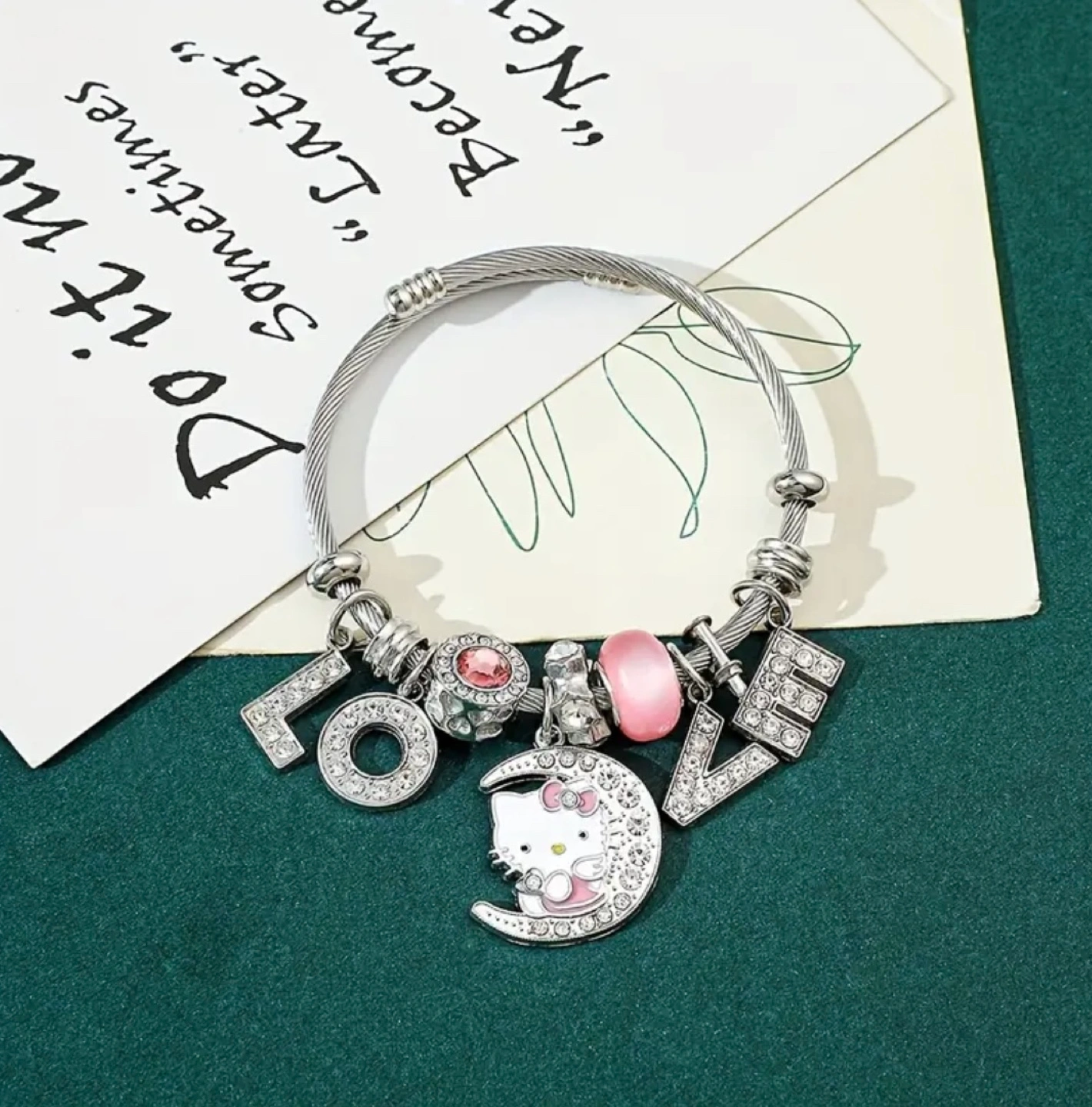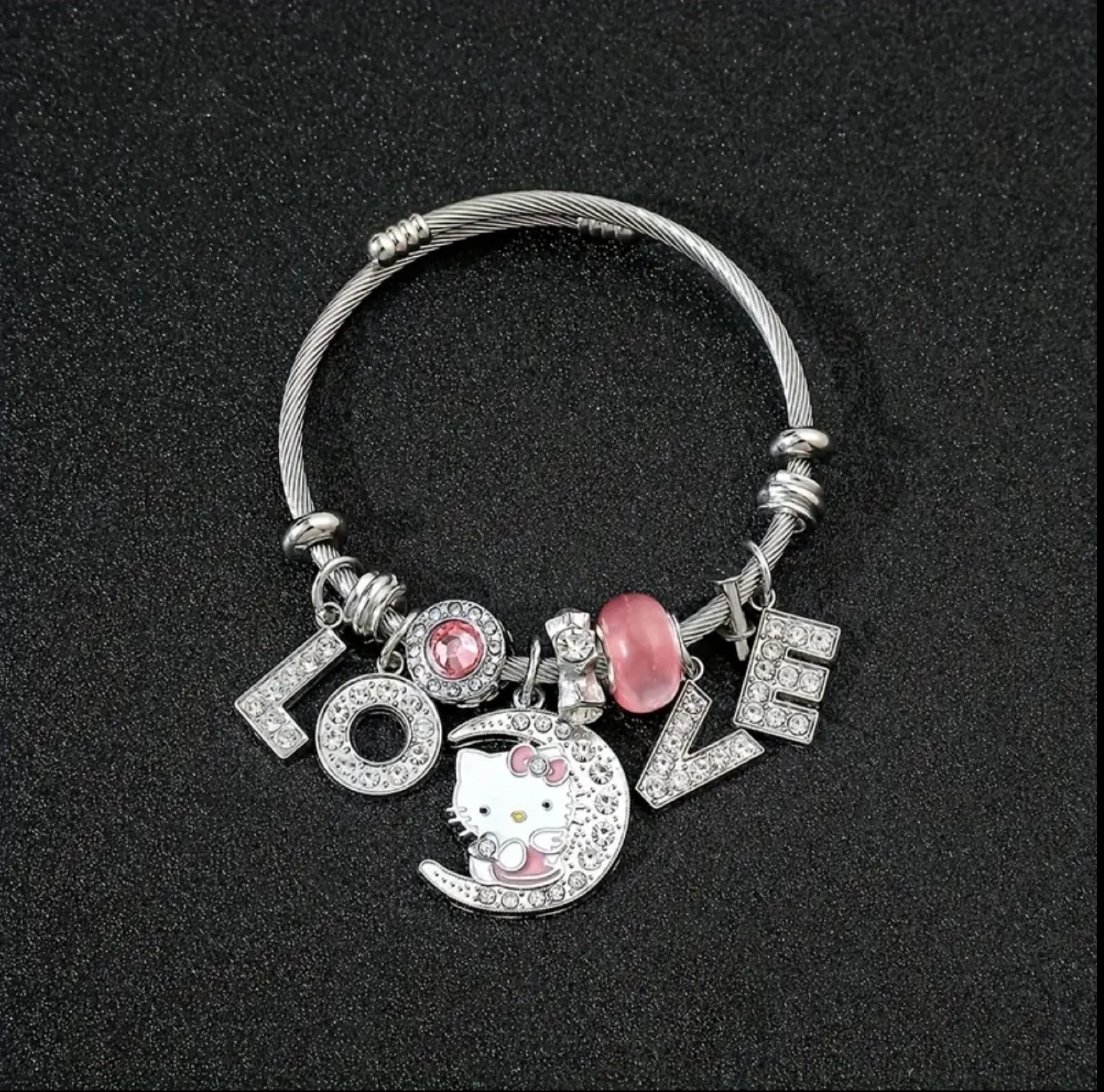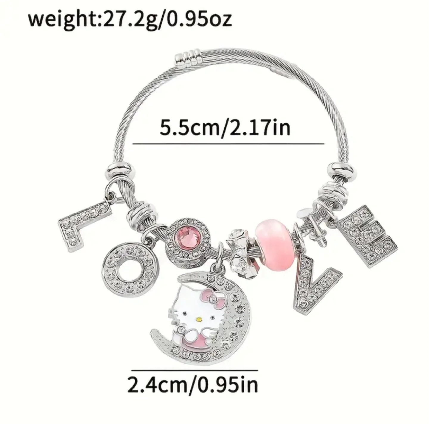 Silver tone metal bangle bracelet. Features Hello Kitty charm, pink and clear rhinestone accents, and LOVE letter charms. Lightweight and pretty.