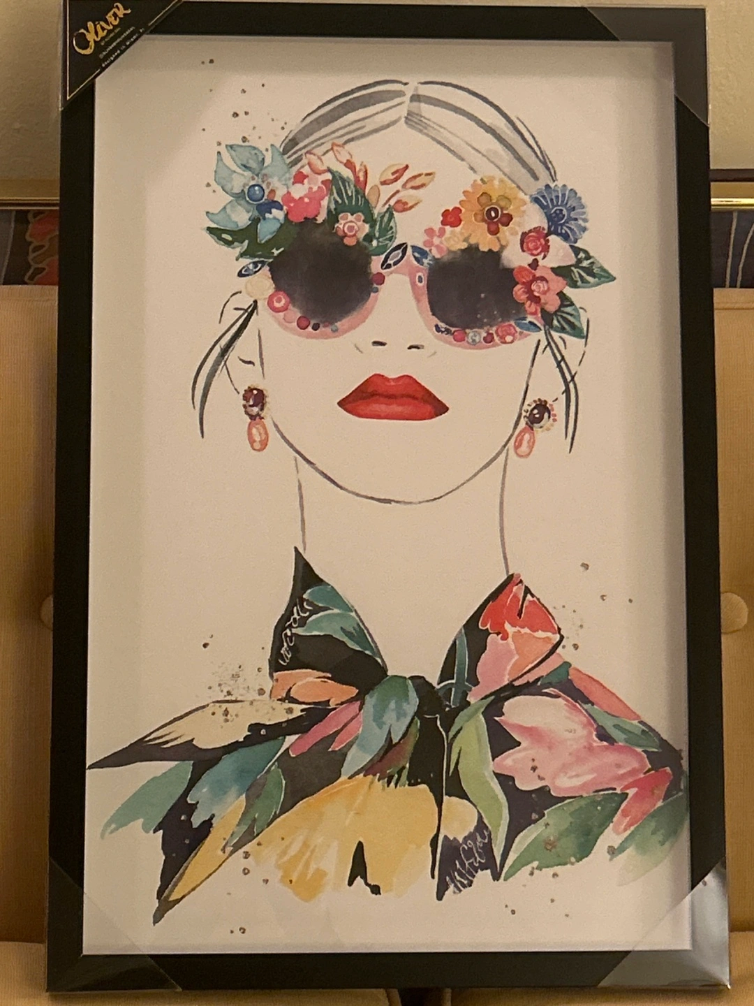16 x 24” Features a woman with floral sunglasses and a patterned scarf. Black frame.