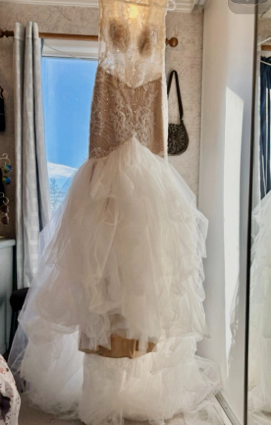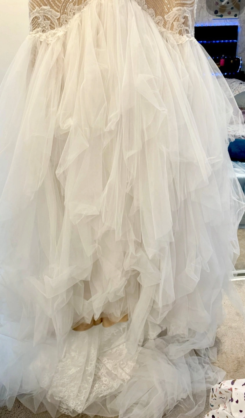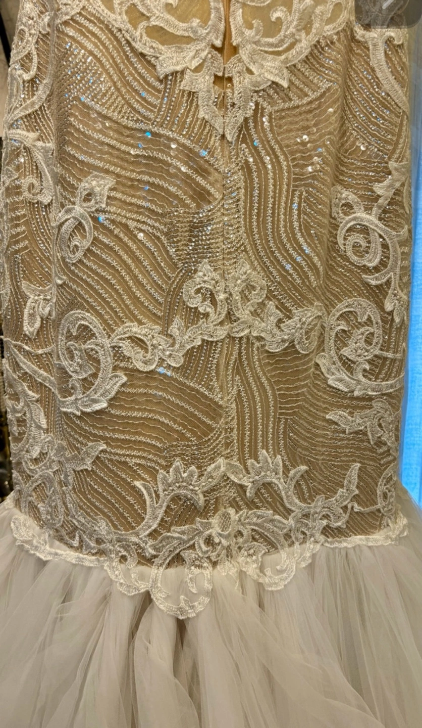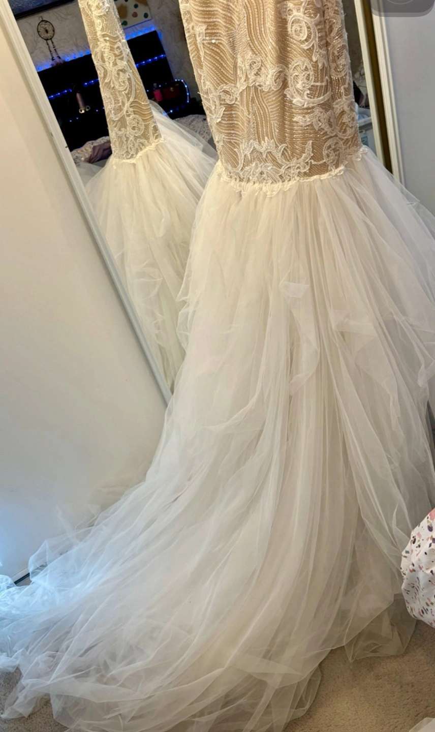 Brand new never used and no longer needed come try on this stunning one of a kind wedding dress, sleeveless, fitted bodice with intricate beading and lace detailing. Features a flattering mermaid silhouette and a dramatic layered tulle skirt into a train