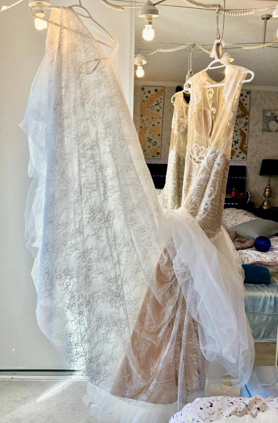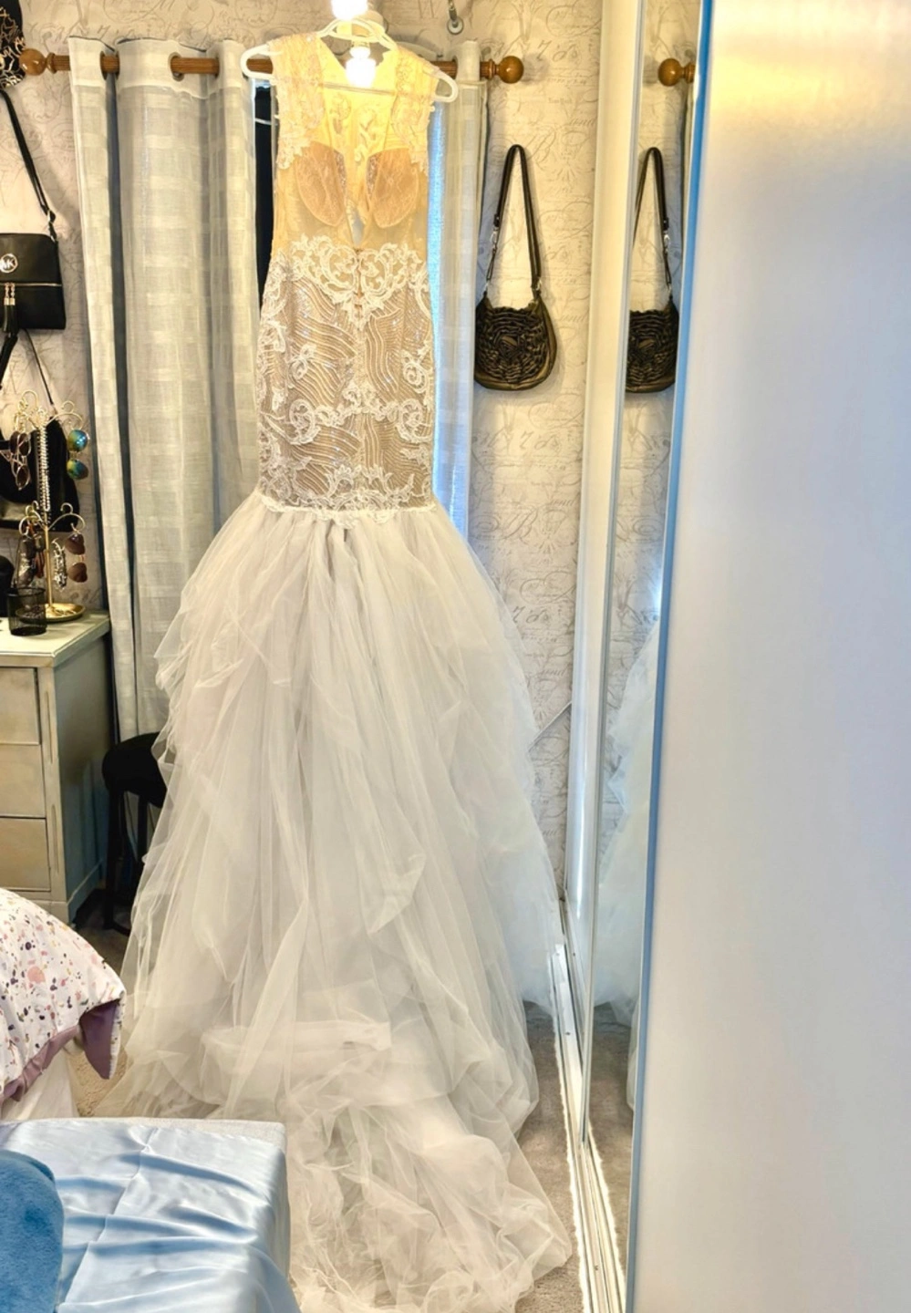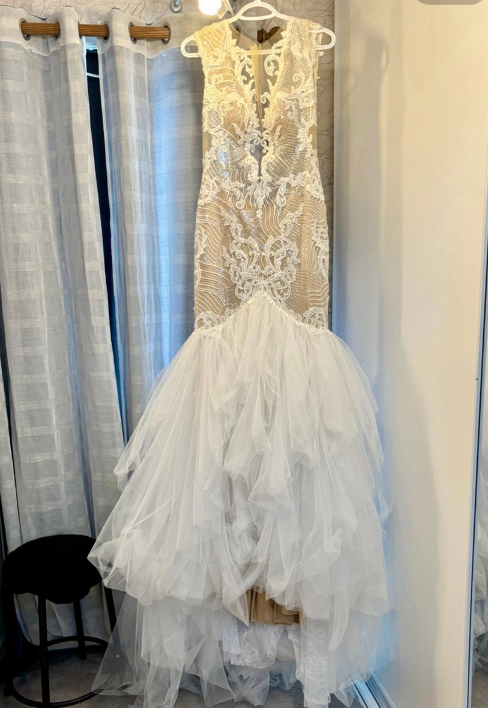 Brand new never used and no longer needed come try on this stunning one of a kind wedding dress, sleeveless, fitted bodice with intricate beading and lace detailing. Features a flattering mermaid silhouette and a dramatic layered tulle skirt into a train