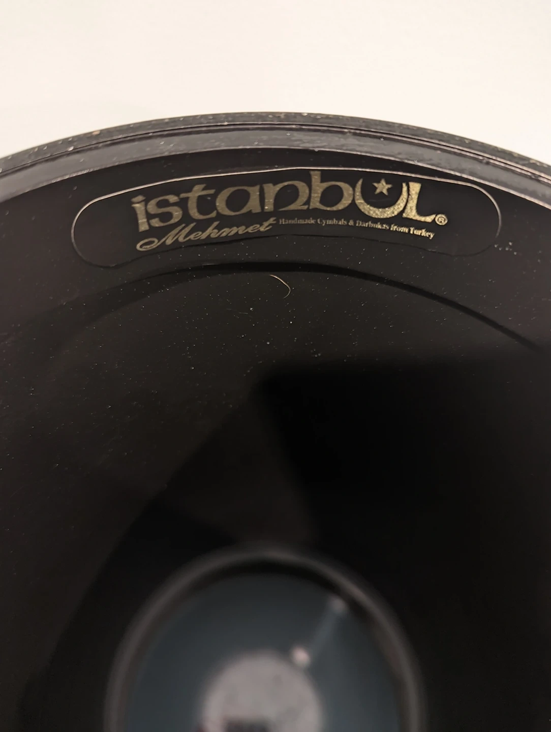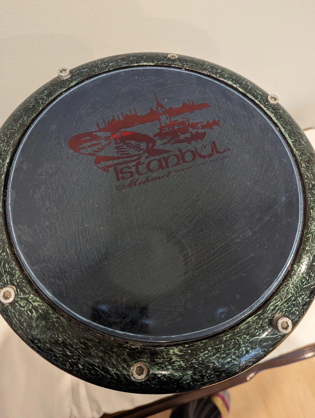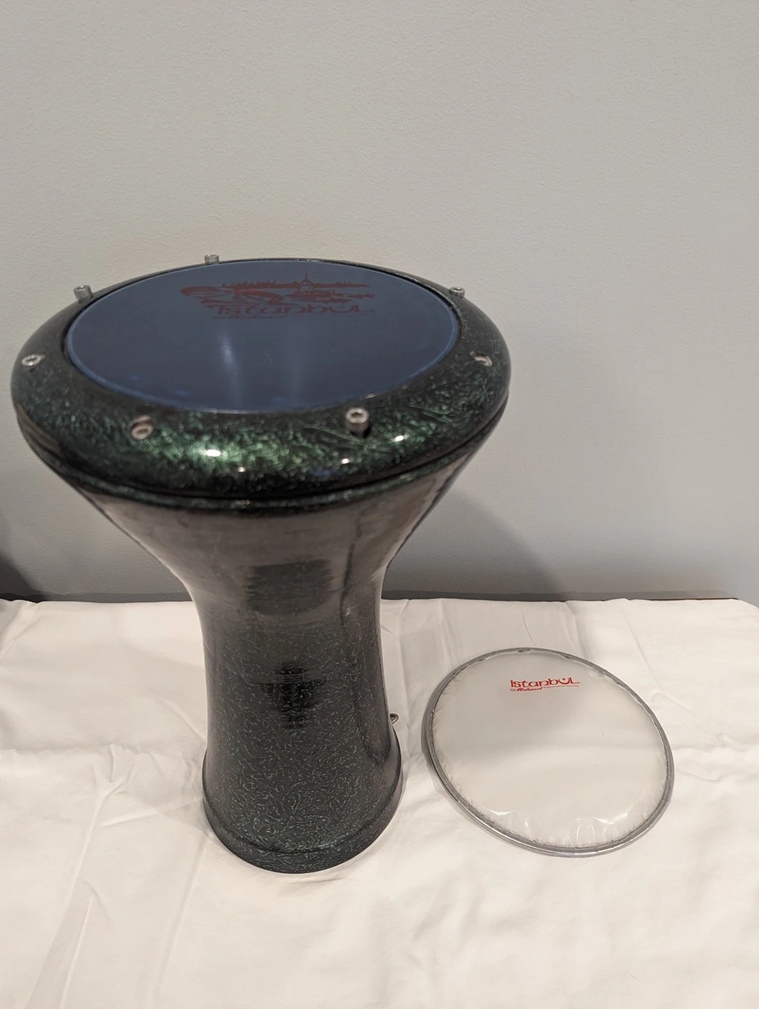 Bought in Greece and made in Turkey. This beautiful, powerful, metal hand drum has a green and black mottled finish, an extra skin, and a ring for a strap.