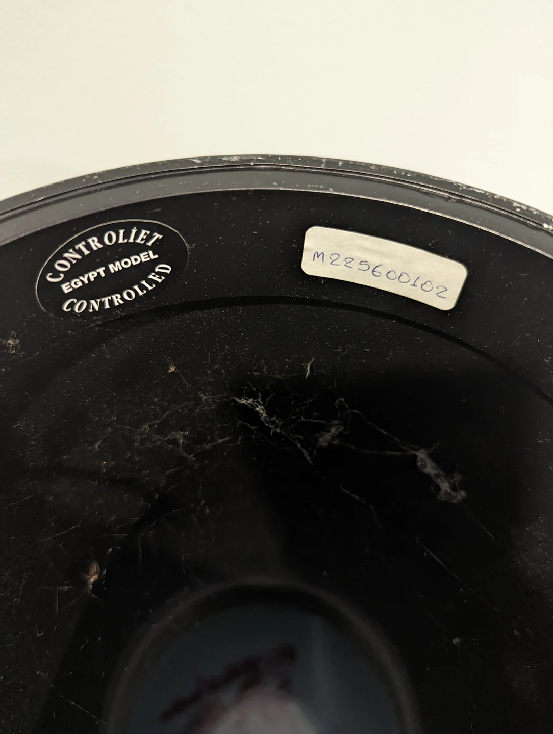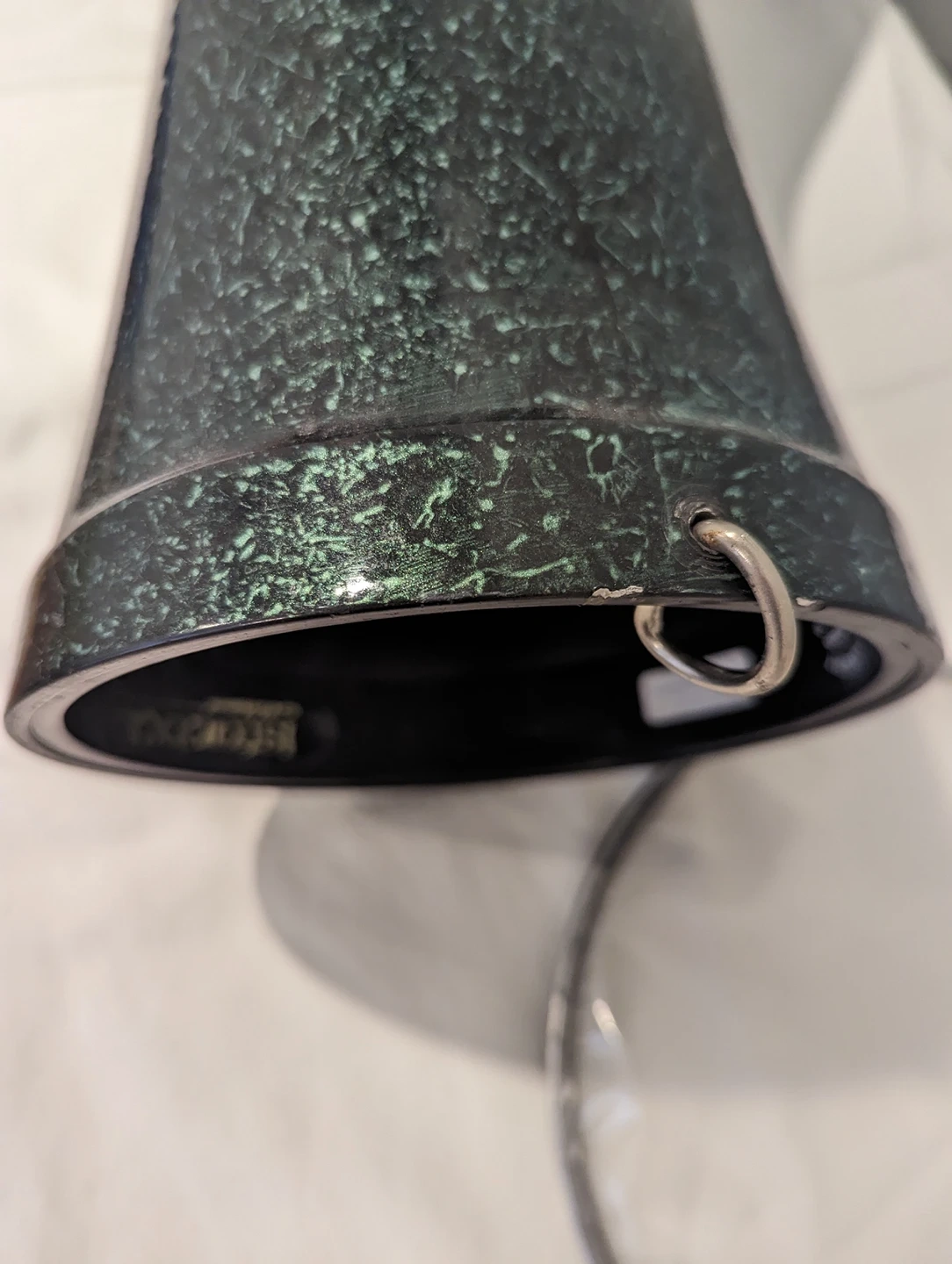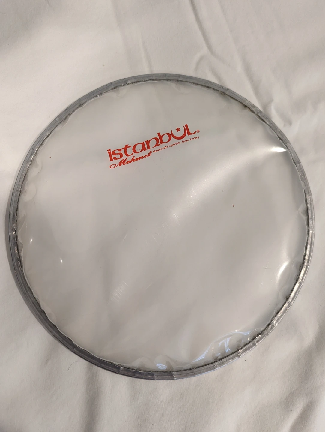 Bought in Greece and made in Turkey. This beautiful, powerful, metal hand drum has a green and black mottled finish, an extra skin, and a ring for a strap.