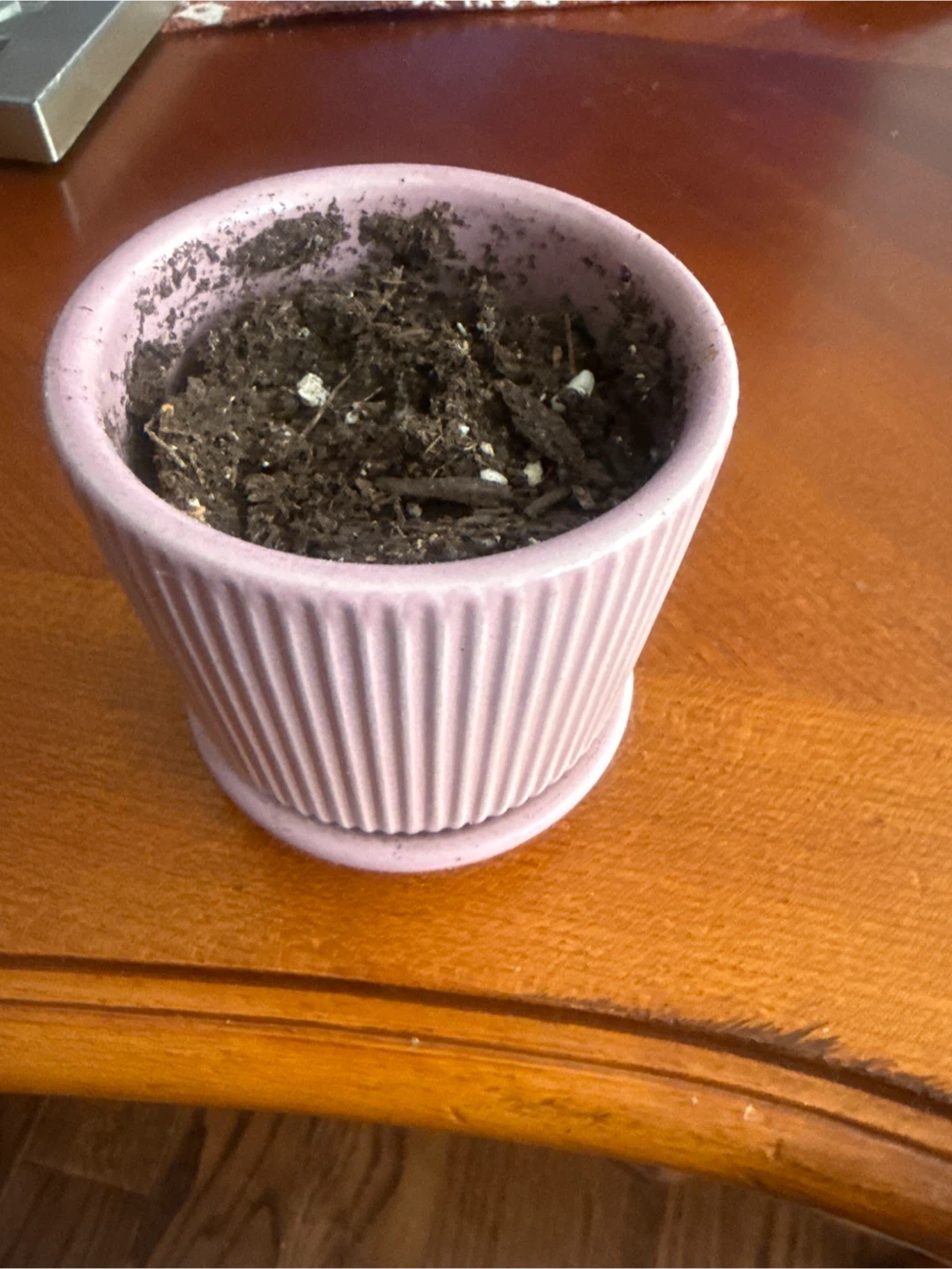 This pretty pink ceramic pot comes with a matching saucer. It's ready for your favourite small plant! The ribbed design adds a nice touch to any space.