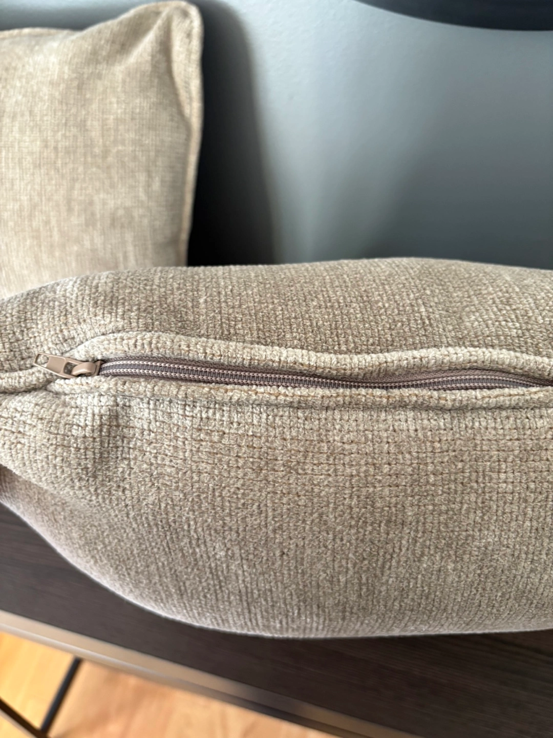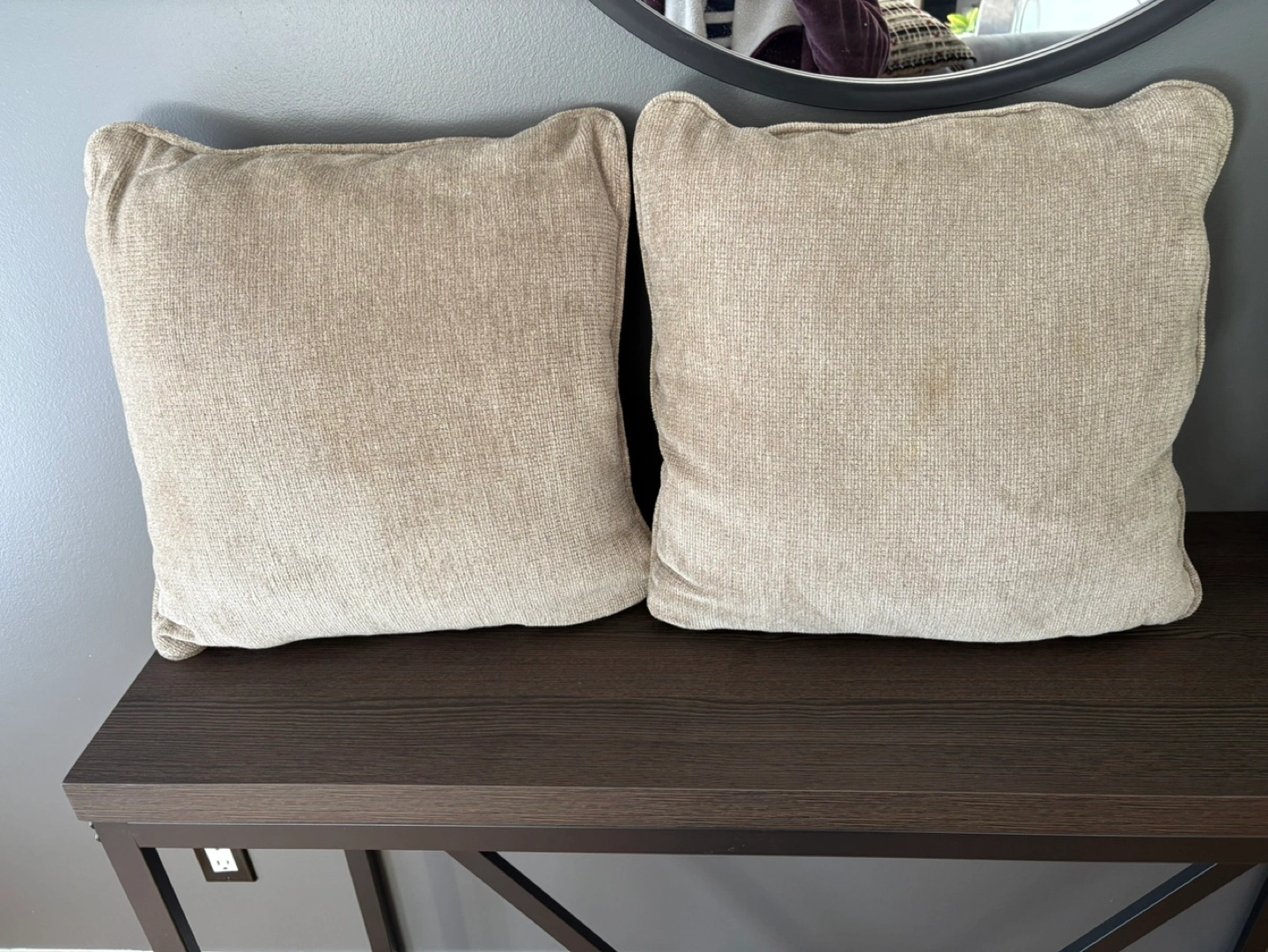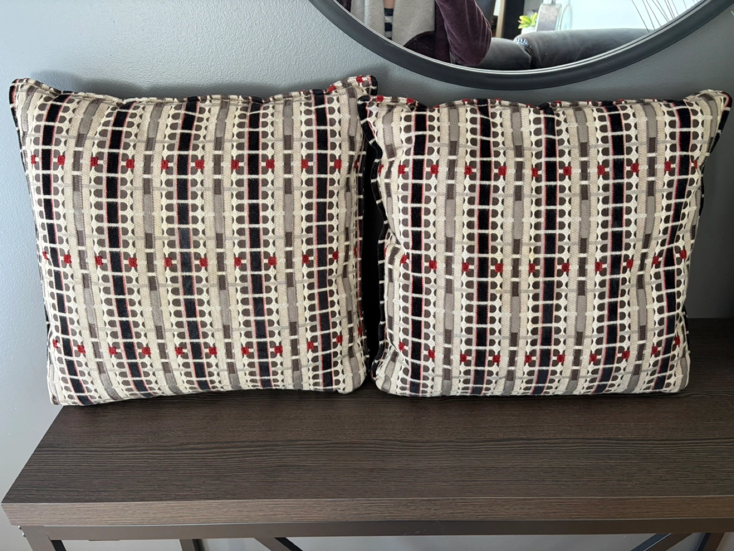 26LIKE NEW - WERE USED FOR STAGING 2 SETS - $10 A SET Solid cushions - light brown Mixed set - 3 tones of brown/red/black/grey Zippered cushions for easy laundering. Measure 16”/16”. Sf home PICK UP/DELIVERY FENELON or LINDSAY