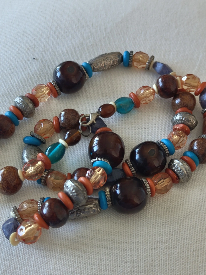 Multi-strand necklace. Features brown and orange beads, turquoise accents, and silver coloured spacers. Clasp closure.