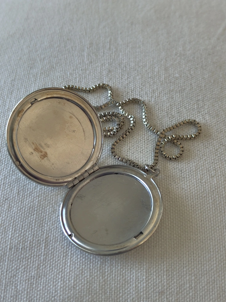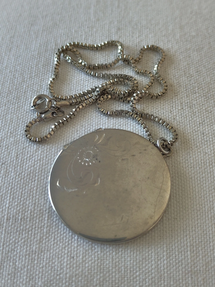 Circular locket pendant. Silver tone finish. Floral engraved design. Box clasp closure. Delicate chain necklace. Pre-owned.