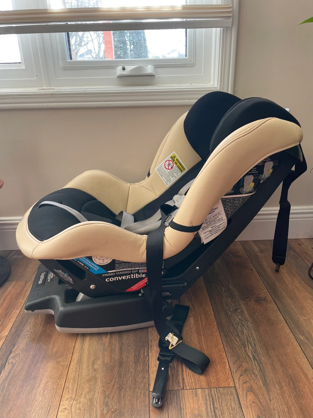 Selling a Peg Perego Primo Viaggio 5-65 convertible car seat in great condition. Never been in an accident, clean, and well-maintained. Suitable for rear-facing (5–45 lbs) and forward-facing (22–65 lbs), with an adjustable harness and superior safety features. Beige and black.