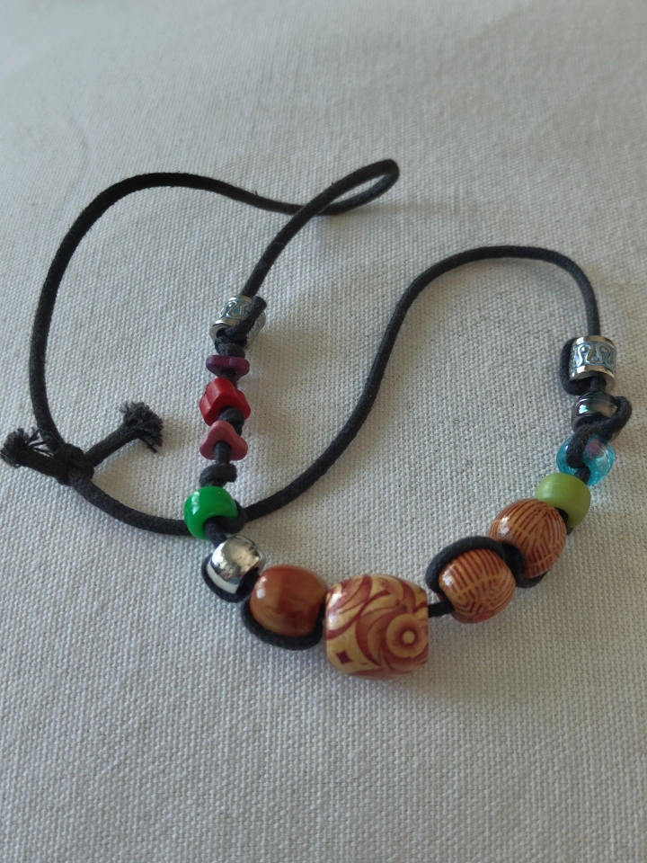 Unique necklace featuring colourful beads and metal accents. Black cord, wooden beads, and small glass beads. Good for everyday wear.