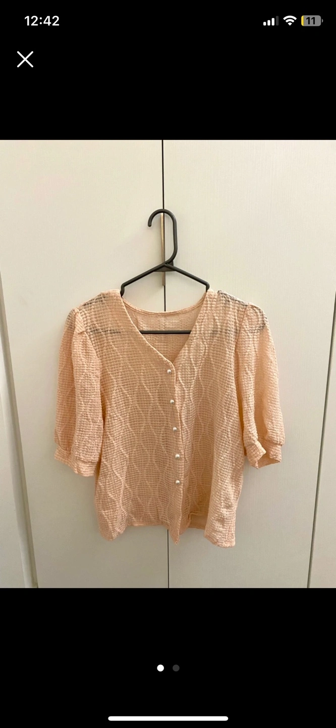 Adorable peach-coloured blouse from Korea. Features puff sleeves and a button-down front. Lightweight and breathable fabric. Perfect for spring or summer.