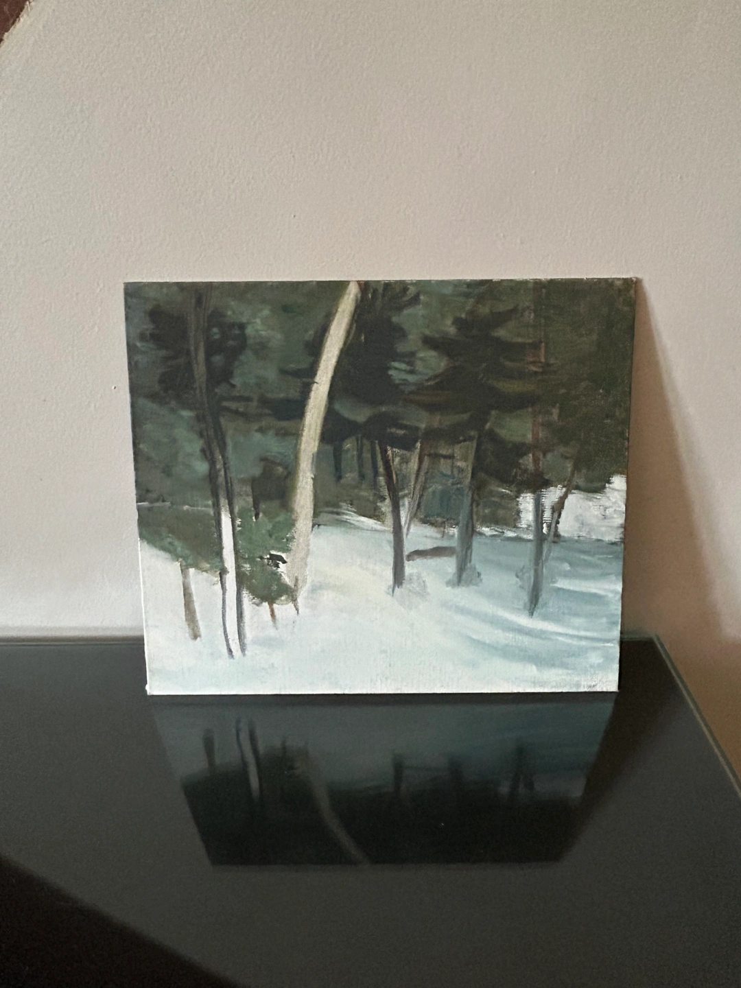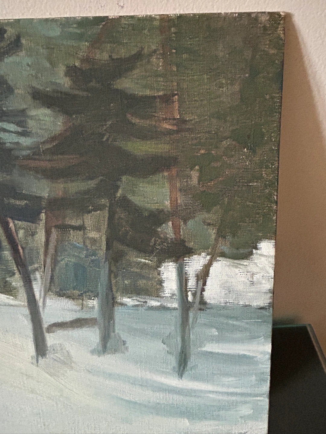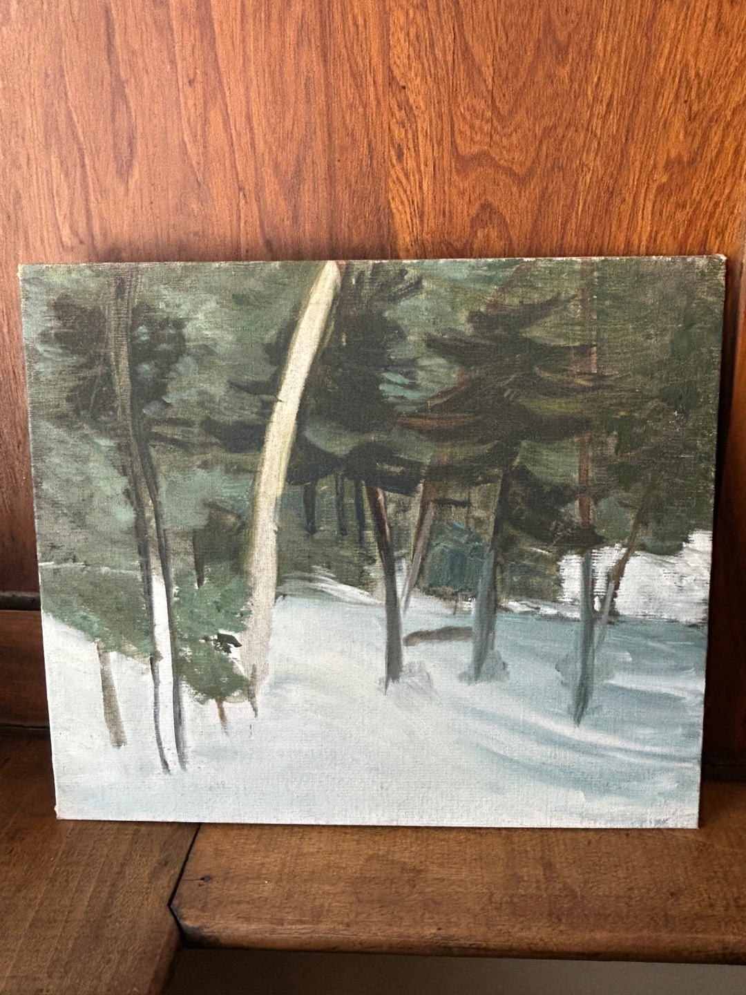 The winter fir pine trees and snow is 12 x 14 inches - lovely group of Seven or Emily Carr feeling to this one