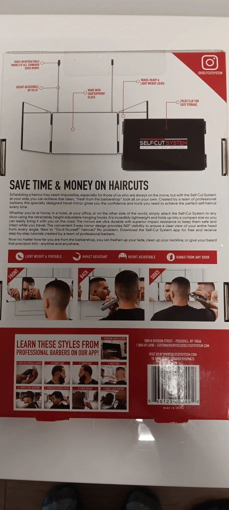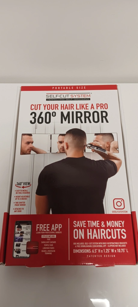 Portable, adjustable mirror. Perfect for at-home haircuts. Includes app with tutorials from professional barbers. Lightweight and easy to install. Save time and money.