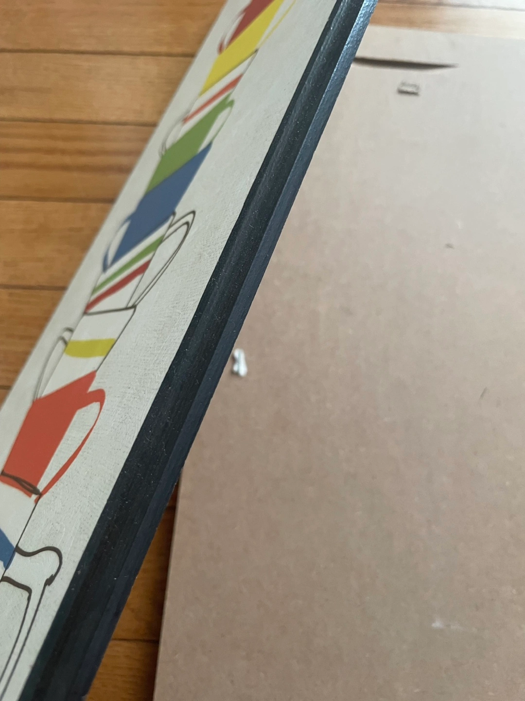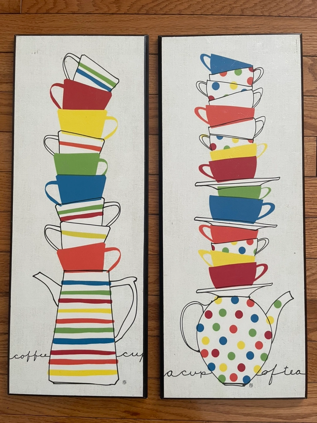 Pair of colourful kitchen-themed wall art prints. Features stacks of cups and teapots. A cute addition to any kitchen or dining room. Ready to hang.