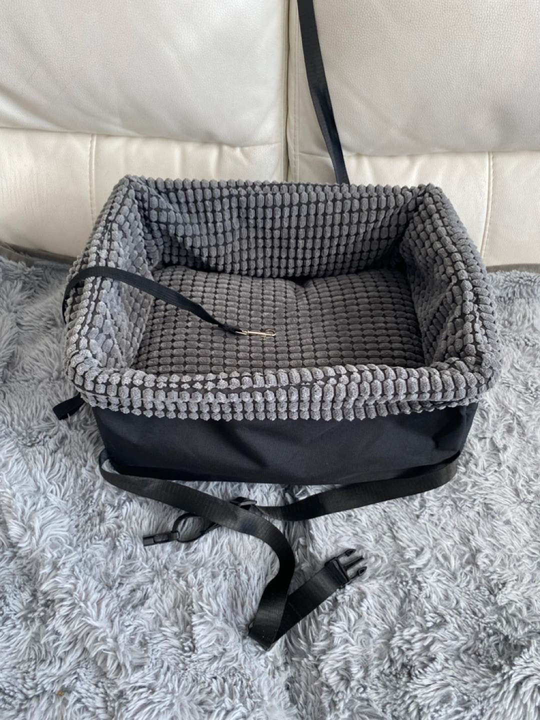 Never used. Small pet car seat. Grey corduroy interior. Black exterior and straps. Secure your pet for safe travels.