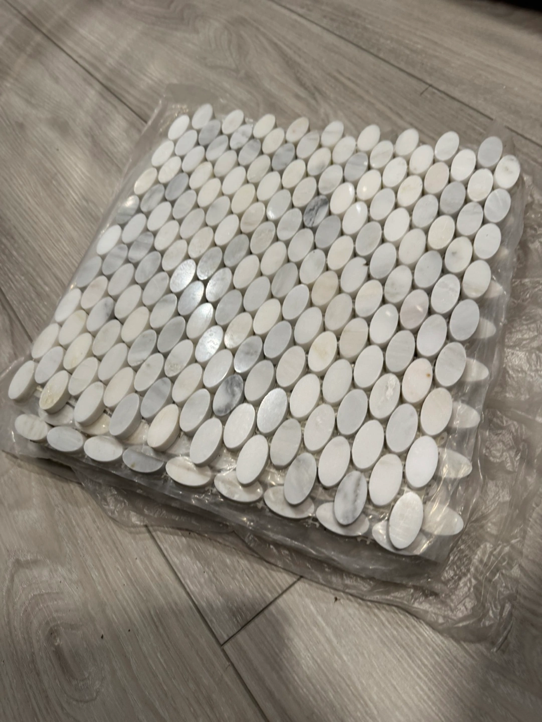 52Unused 6 Sheets of white marble mosaic tiles. Oval-shaped tiles. Perfect for backsplashes or accent walls. Sold as shown. Retail: $15.99/Sheet x 6