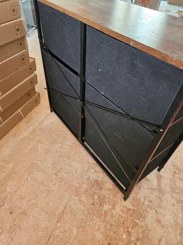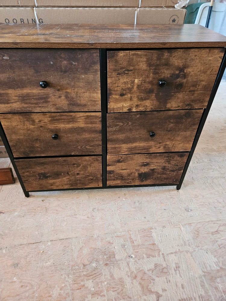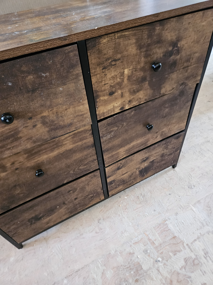 Six-drawer dresser. Rustic brown wood finish with black metal accents. Solid wood construction. Some minor cosmetic imperfections.