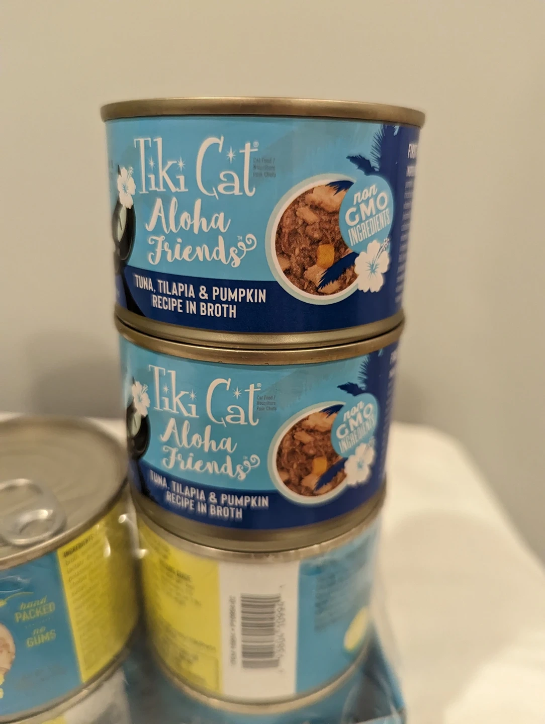 -Two 6oz cans of Tiki Cans Aloha Friends "tuna, tilapia, & pumpkin recipe in broth"