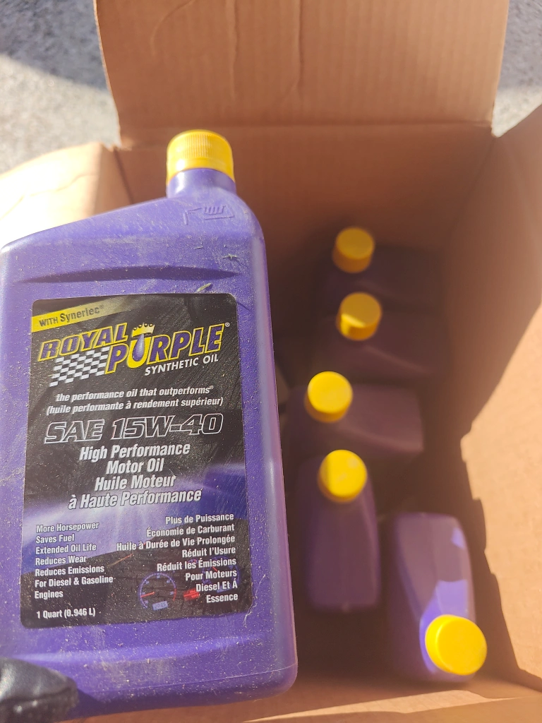 6 qrt Royal Purple SAE 15W-40 engine oil. fee oil drain pan!