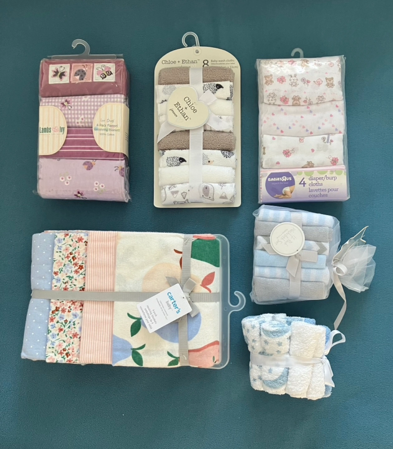 Perfect for a baby shower gift. Bundle of baby wash cloths and receiving blankets, includes brands Carter's, Lambs Ivy, Babiesrus , Lamour and Chloe + Ethan….