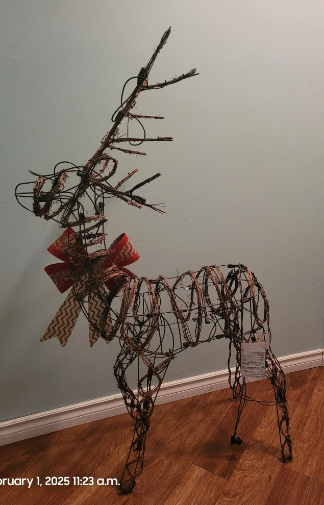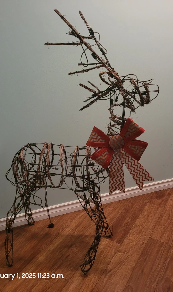 Beautiful wire reindeer Christmas decoration. Features integrated LED lights and a decorative bow. Perfect for indoor or outdoor use. Adds a touch of rustic charm to your holiday decor.