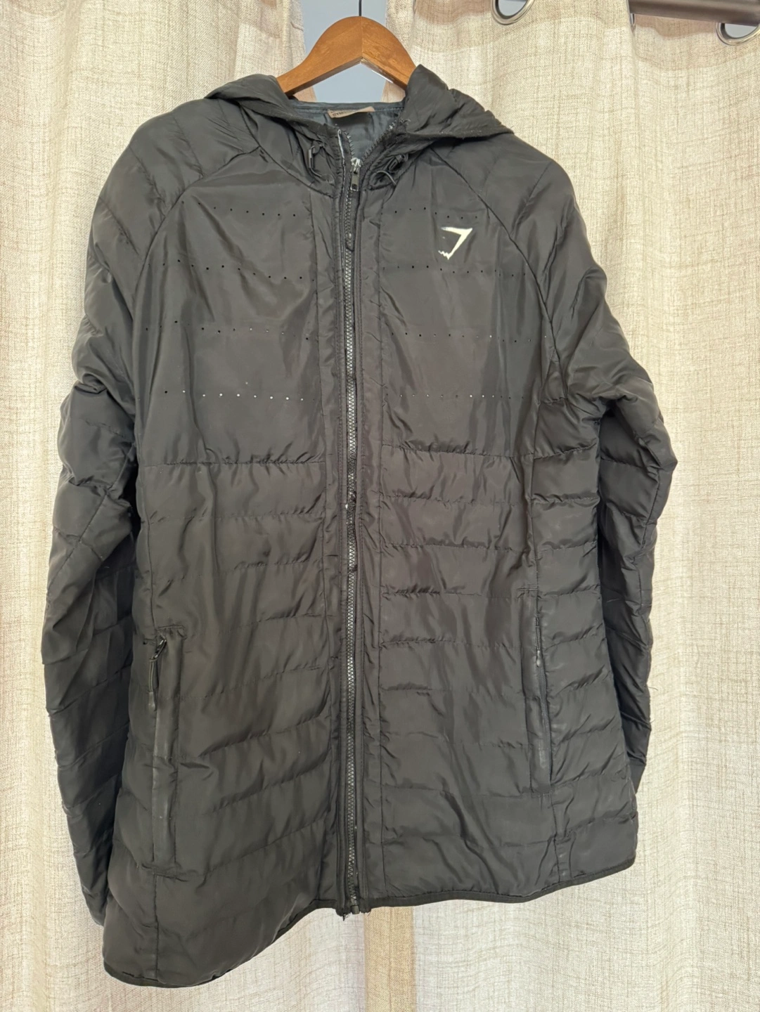 Men's black puffer jacket. Features a hood and zip closure. Good for colder weather. Lightweight and warm.