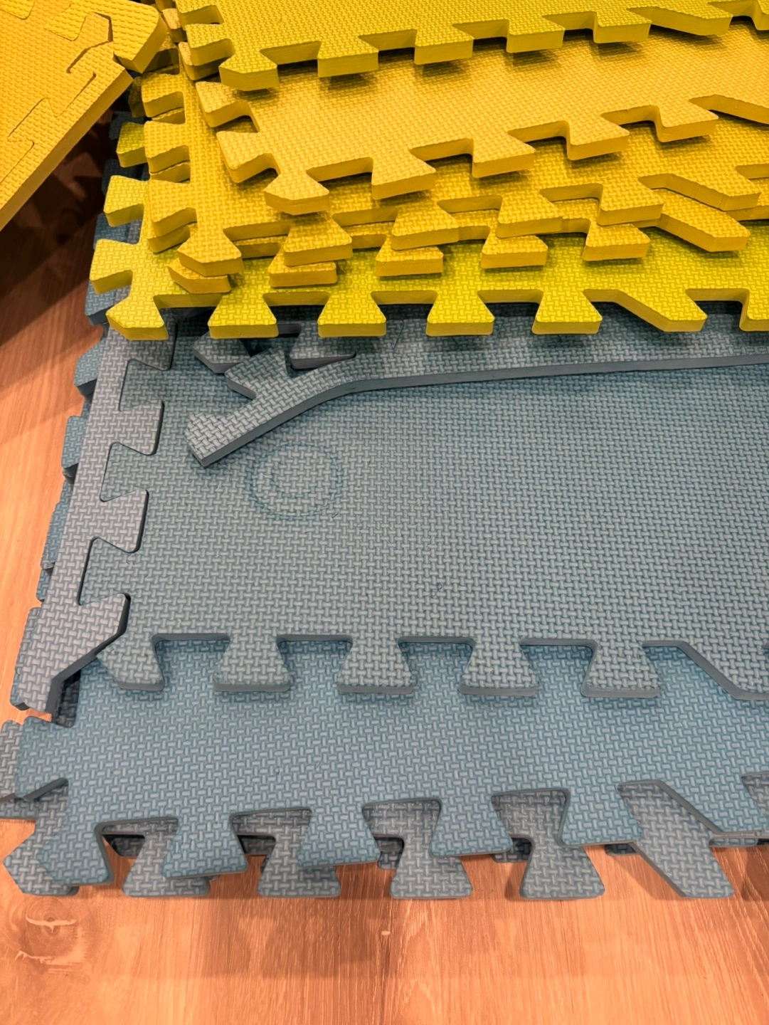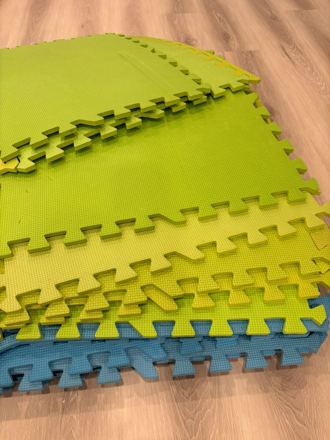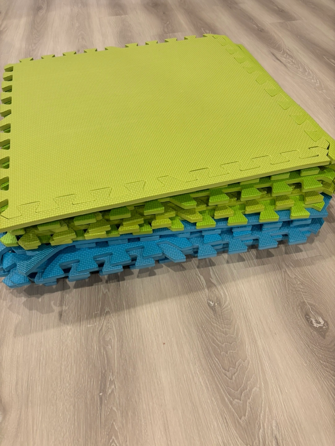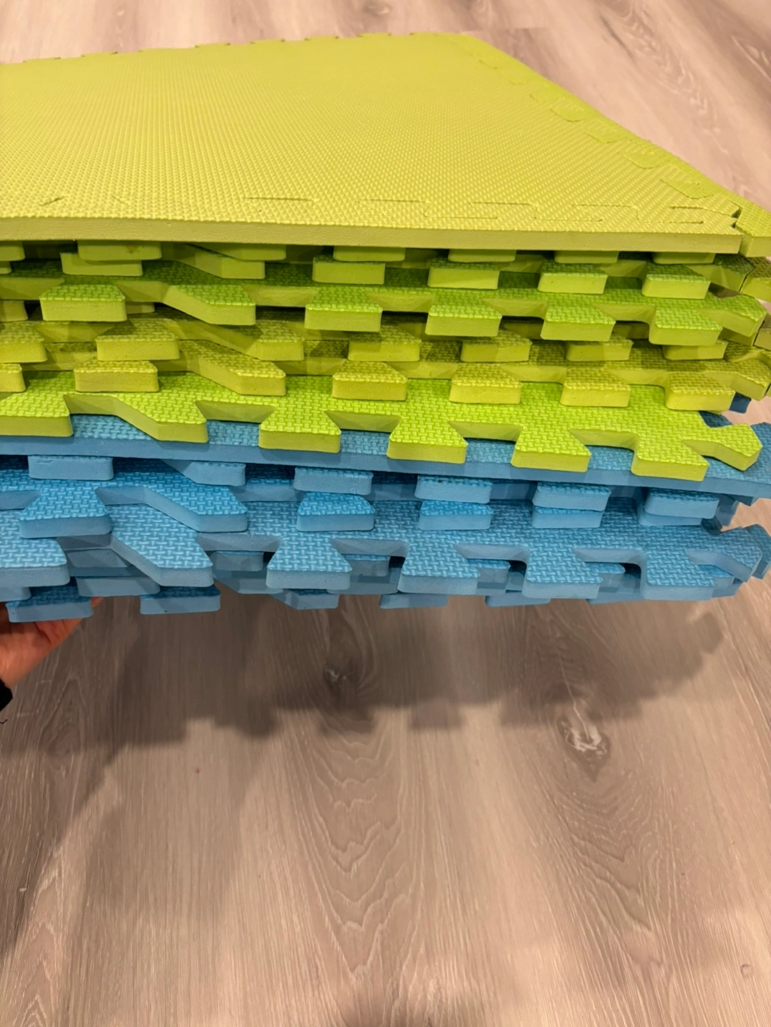 Smoke free pet free home Pick up only Yonge & Steeles Item brought to driveway 6 green 6 blue, makes 4x4 square Large set of interlocking foam mats. Great for kids play area, gym flooring or home use, Garage. Good condition - light green and blue. Easy to assemble and clean.