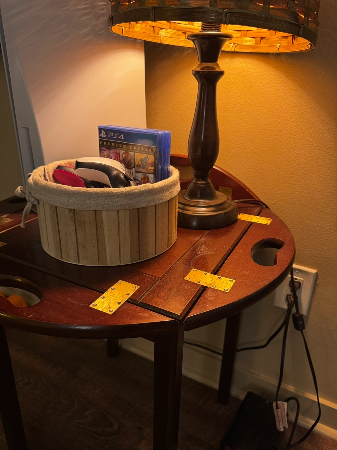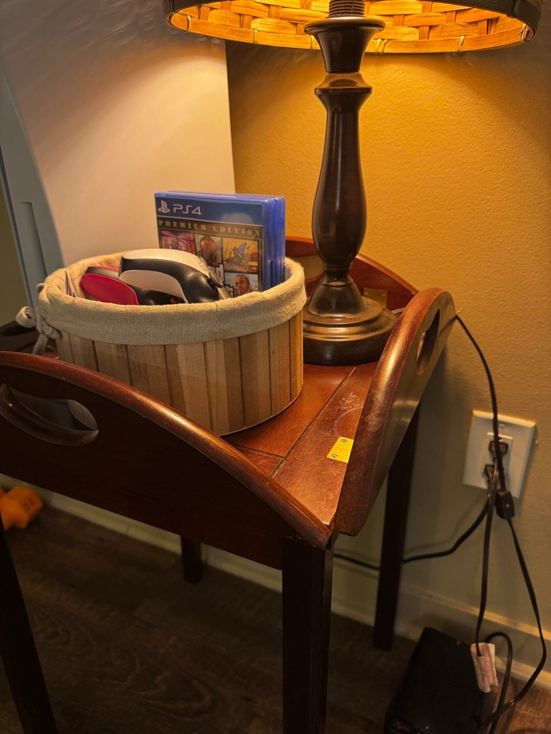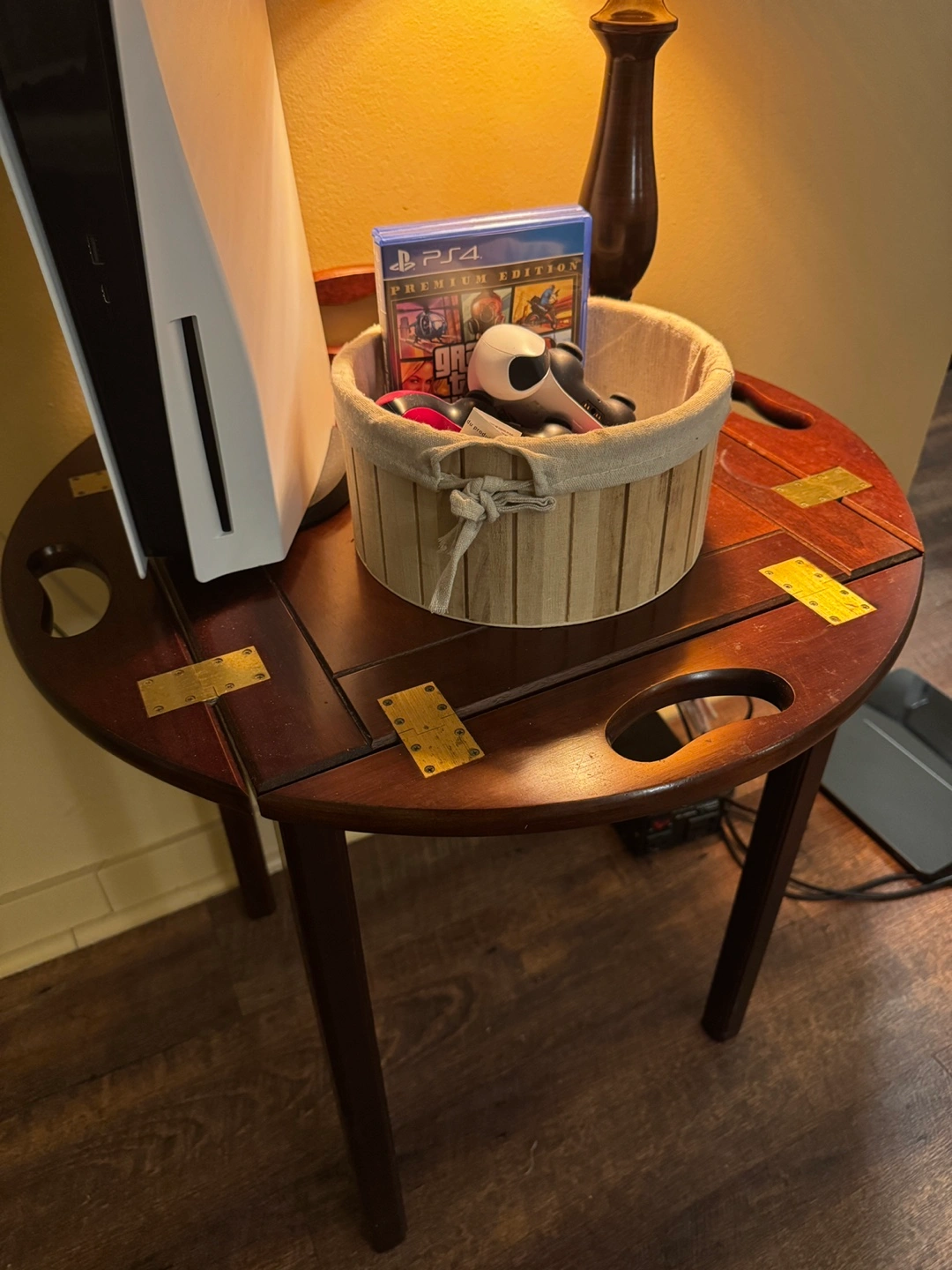 Dark brown Vintage Antique Bombay wooden side table with brass hinges and fold down sides, perfect for small spaces. Don’t need it anymore, replacing it with a new one. Very solid and in good condition.