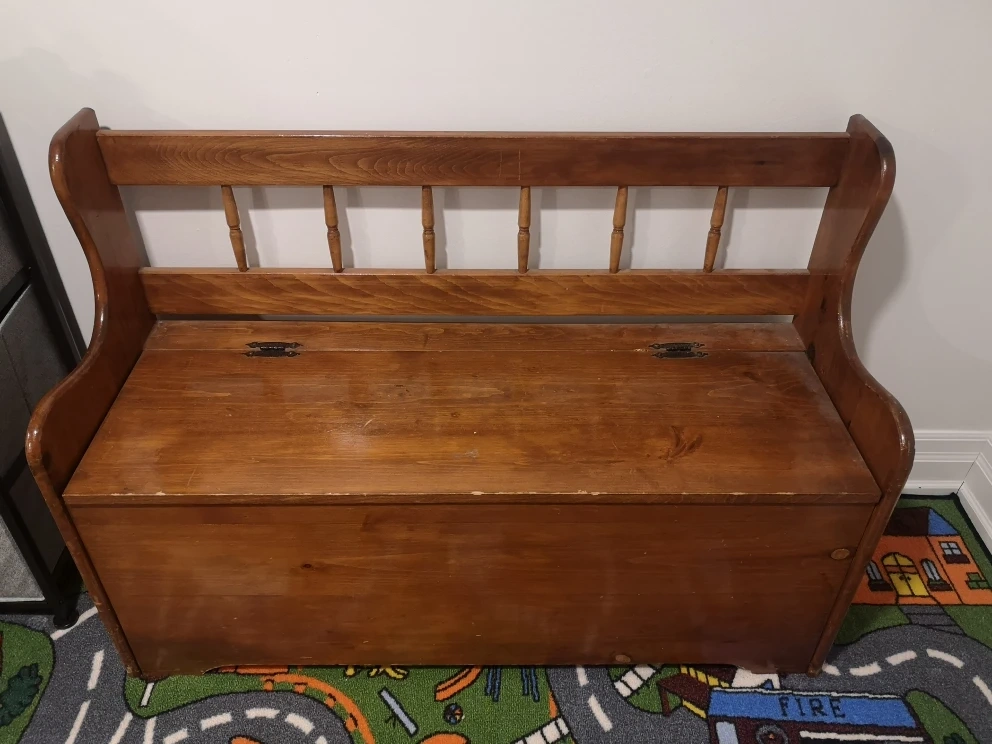 ***toys not included ***wooden toy chest. Needs some love. Bottom needs to be re-secured. Perfect for storing toys or front door bench/storage.