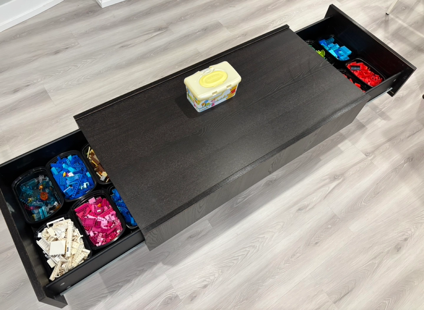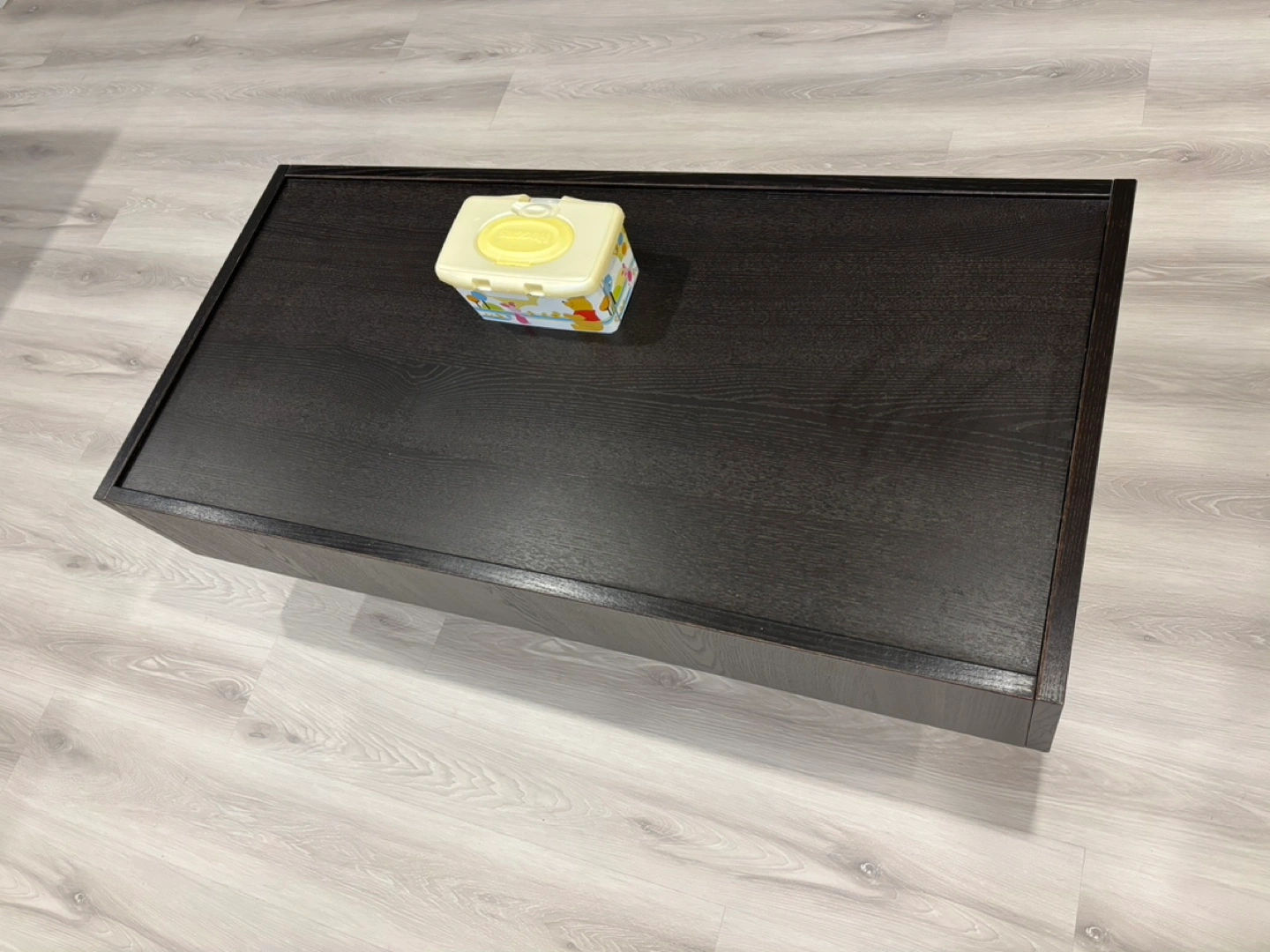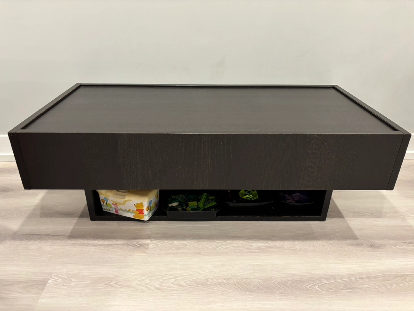 Smoke free pet free home Pick up only Yonge & Steeles Item brought to driveway Make sure your vehicle fits Dark Brown rectangular Coffee Table that doubles as discrete toy storage. Lego is for display and not included. Features two large pull-out drawers, perfect for hiding things. Solid wood construction. Minimalist design. Used as Lego table, as the ledge helps legos from falling on the floor Table in great condition H 16 inches W 23 inches L 48 inches Fully extended length 73 inches