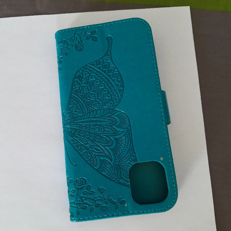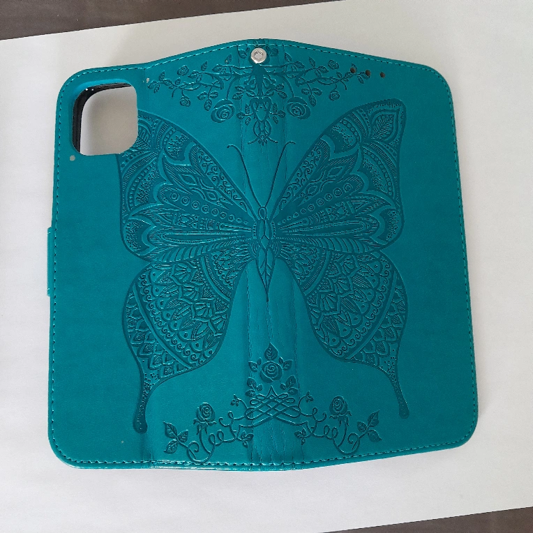 Cute teal phone case with embossed butterfly design. Features a wallet-style design with slots for cards. Compatible with iPhone 11.
