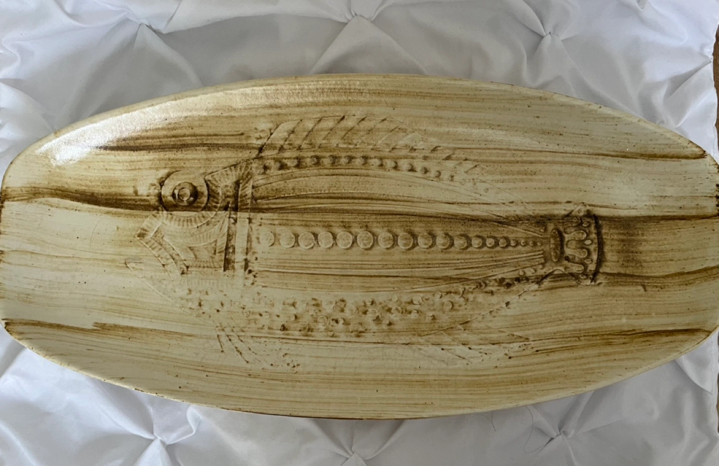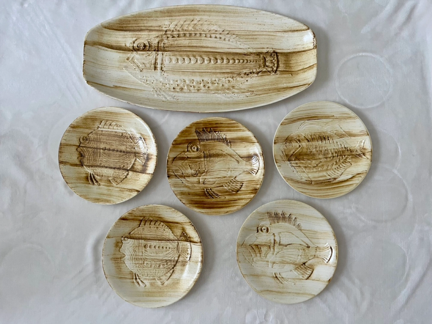 Set of six vintage ceramic pieces. One large oval platter and five smaller plates. All feature a unique embossed fish design. Cream-coloured with brown accents. Shows some signs of age and use, but generally in good condition.