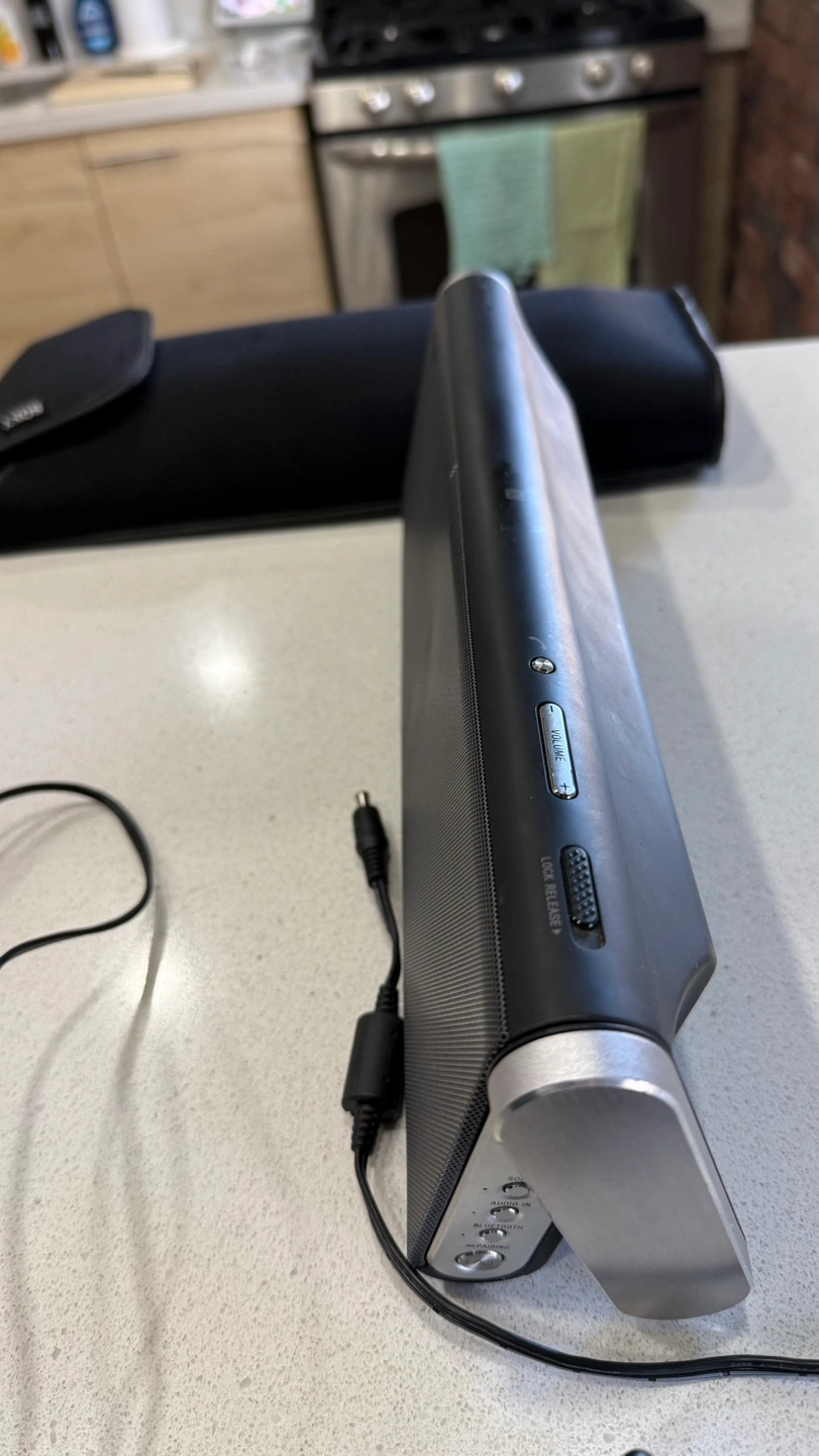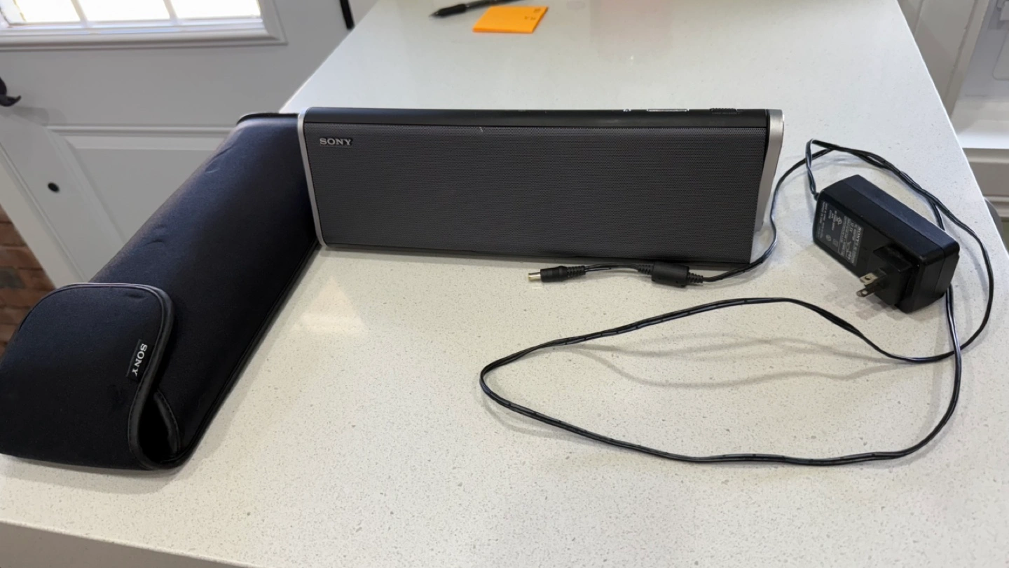 Portable Bluetooth speaker. Includes carrying case and power adapter. Excellent sound quality. NFC enabled.