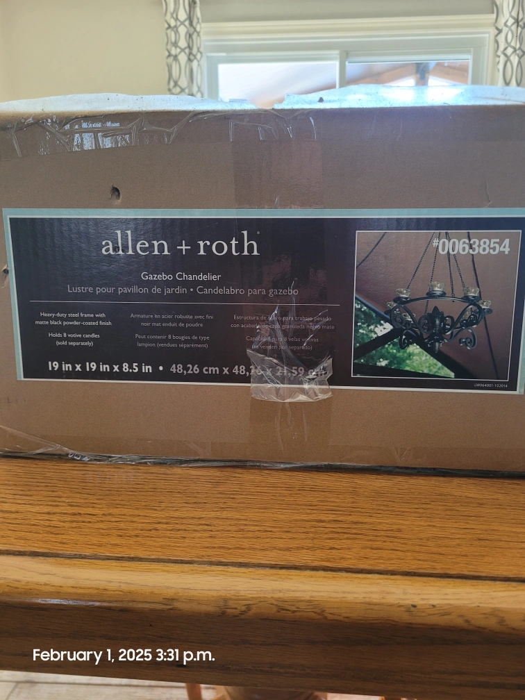 Black metal candle chandelier. Hangs from a chain. Includes six glass candle holders. New in box.