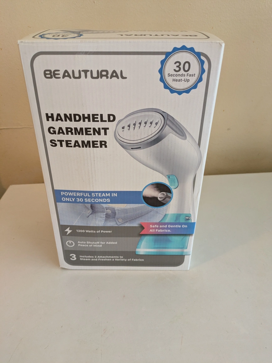 Powerful handheld garment steamer. Heats up in 30 seconds. Good for removing wrinkles. Includes 3 attachments. Removable water tank. Perfect for travel. Original price $45.