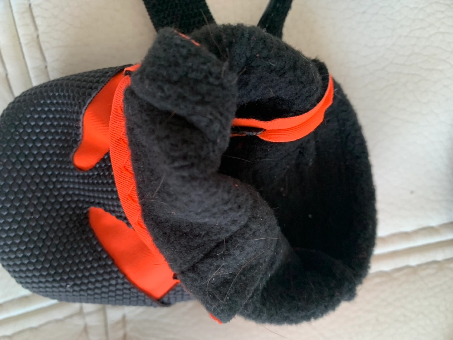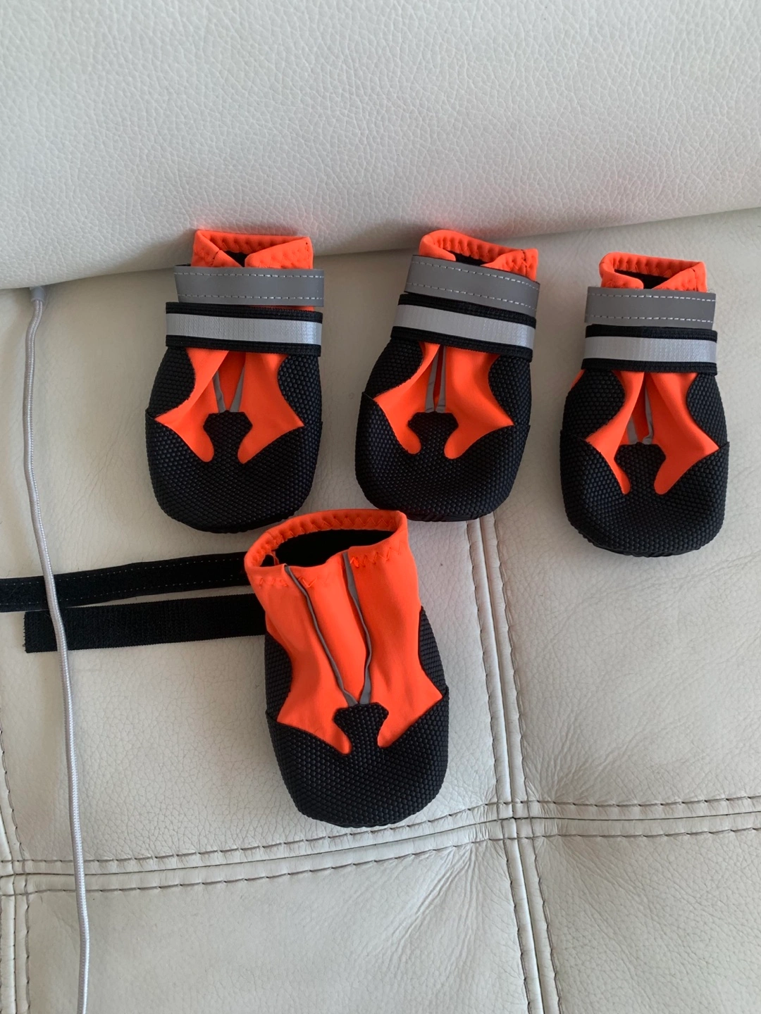 Four waterproof dog boots. Size โXLโ, fits more like a โLโ. Orange and black. Fleece lining. Reflective strips. Velcro closures. Amazing traction and warm!