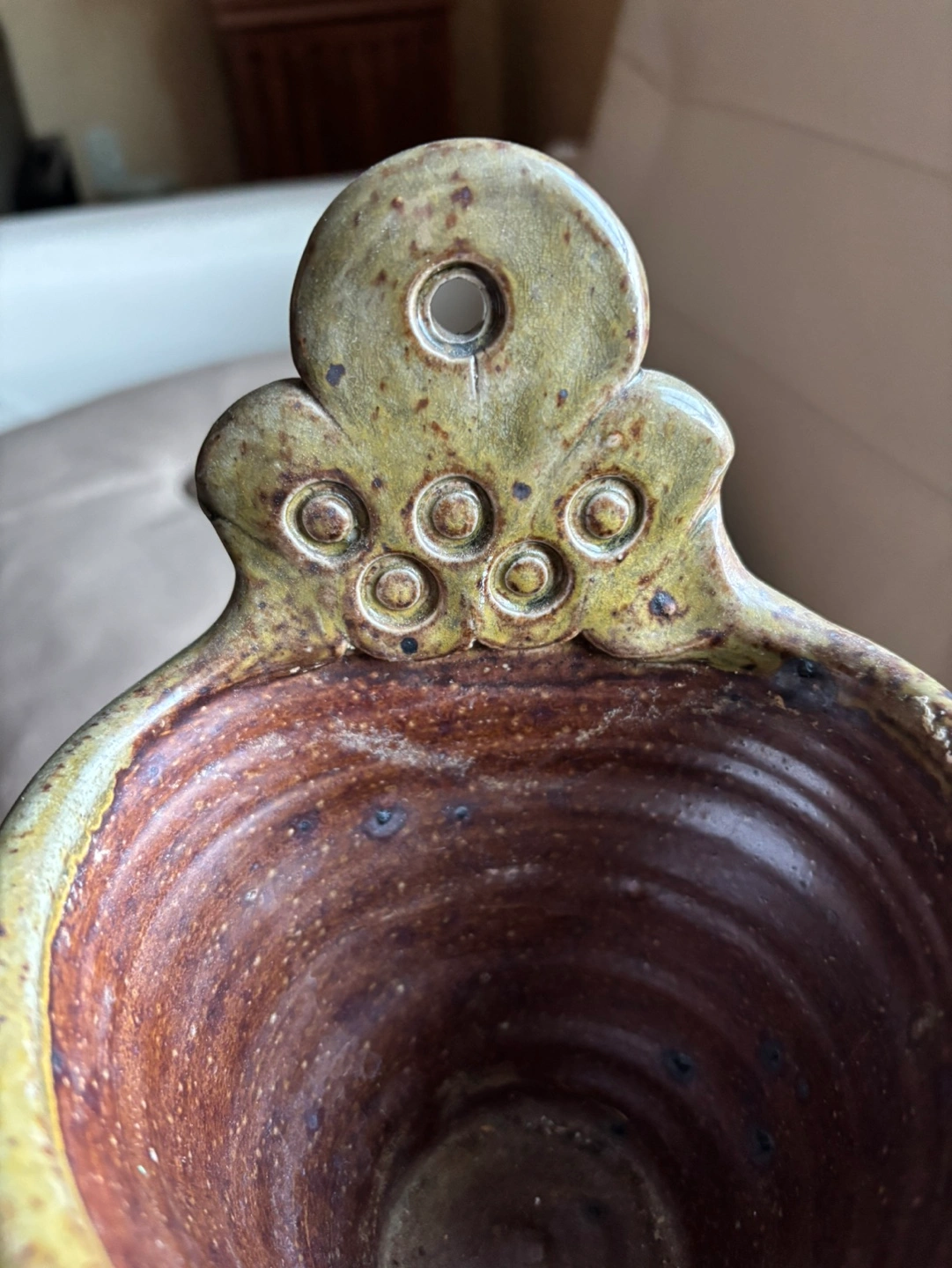 979Unique handmade pottery wall planter. Features a decorative top handle and speckled brown and green glaze. Small, perfect for small plants or other items. From a smoke and pet free home. Pickup only in the St. Lawrence market area of downtown Toronto. Cash only.