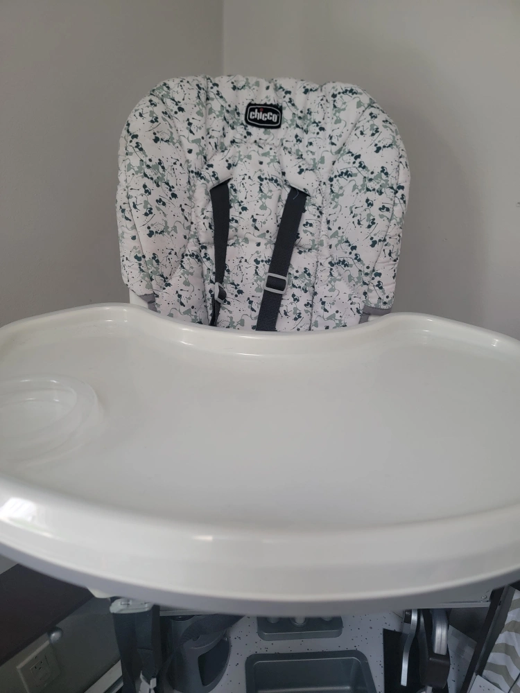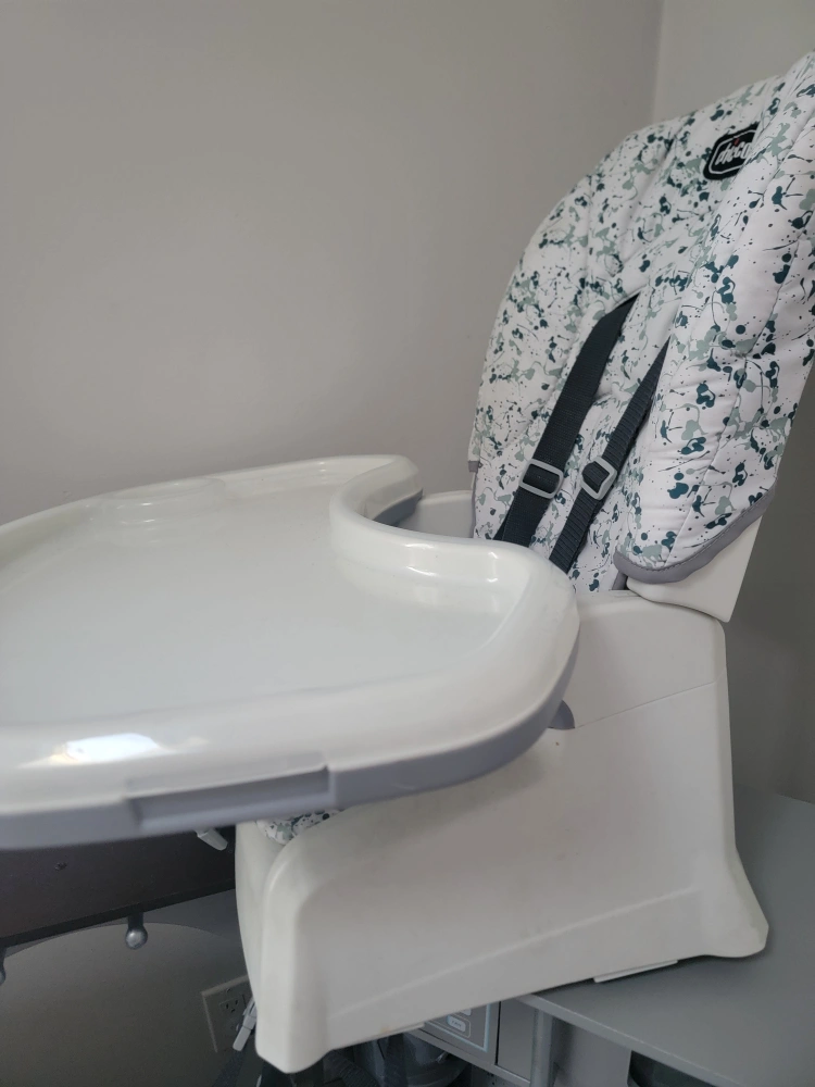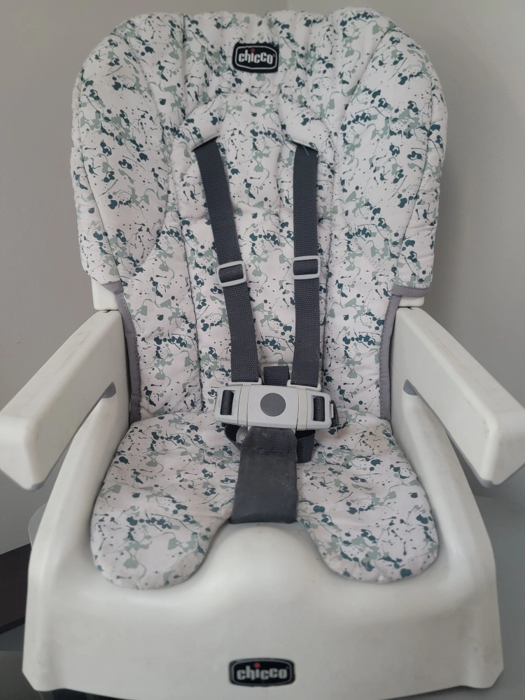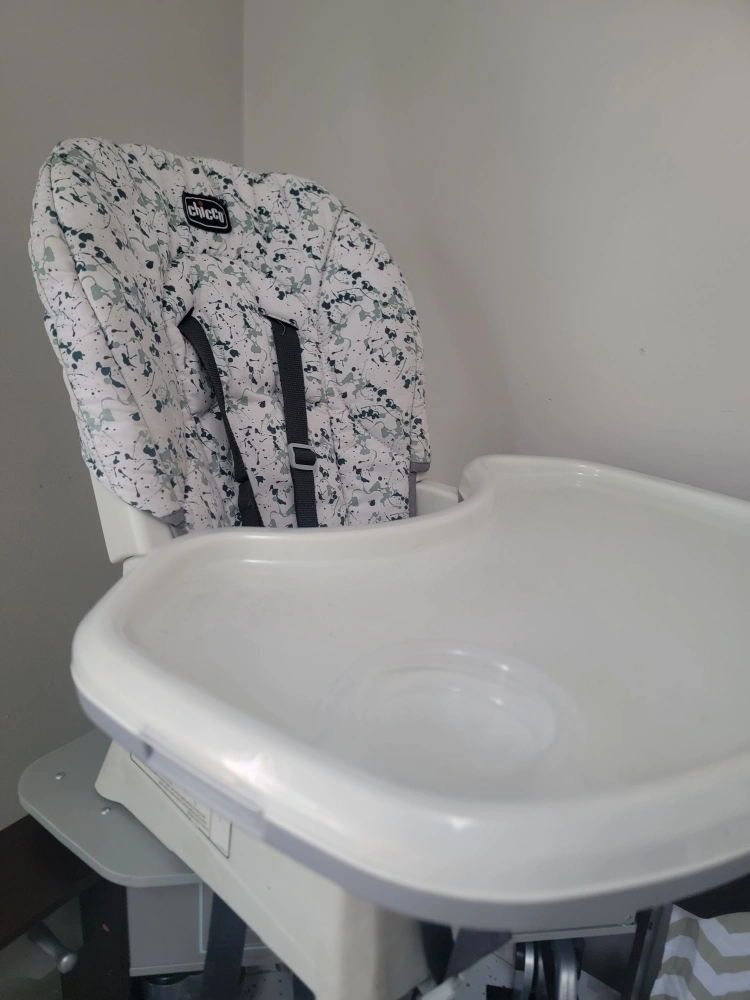 Chicco high chair. Features a removable tray and five-point harness. Grey and white splash pattern. Great for feeding babies and toddlers.