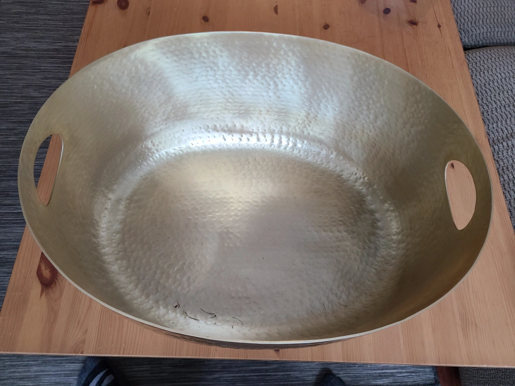 Oval-shaped aluminum tub/basin. Gold hammered metal finish. Two handles on either side. Great for serving, indoor/outdoor storage, or as a decorative piece.