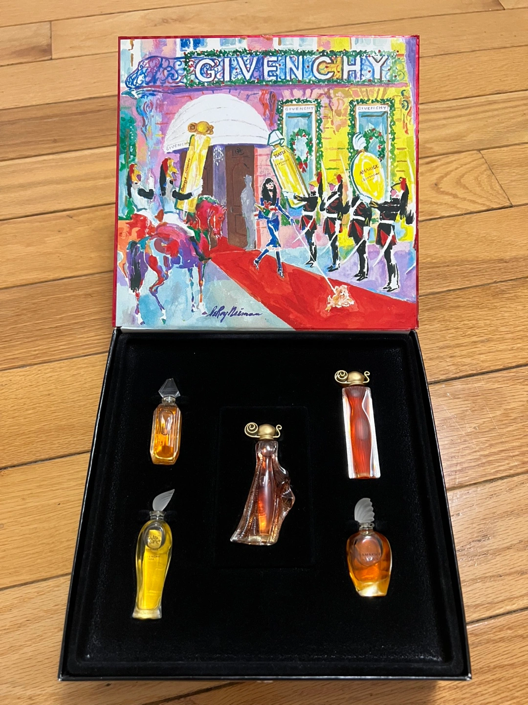 Vintage Givenchy perfume gift set. Five miniature perfumes in a red collector's box. Perfect for collectors. Brand new.