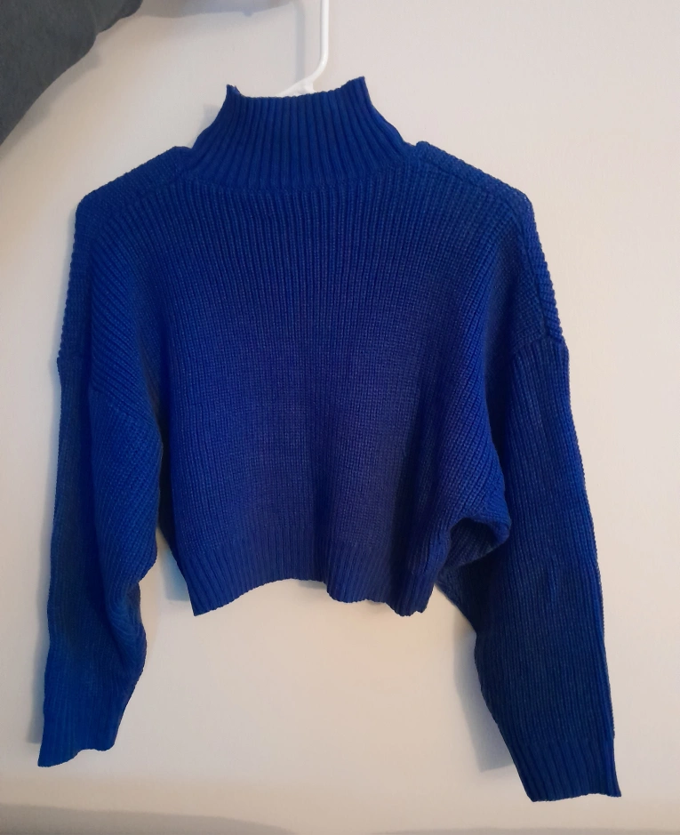Never worn cozy cropped mock neck sweater. Royal blue colour. Long sleeves. Knit material.