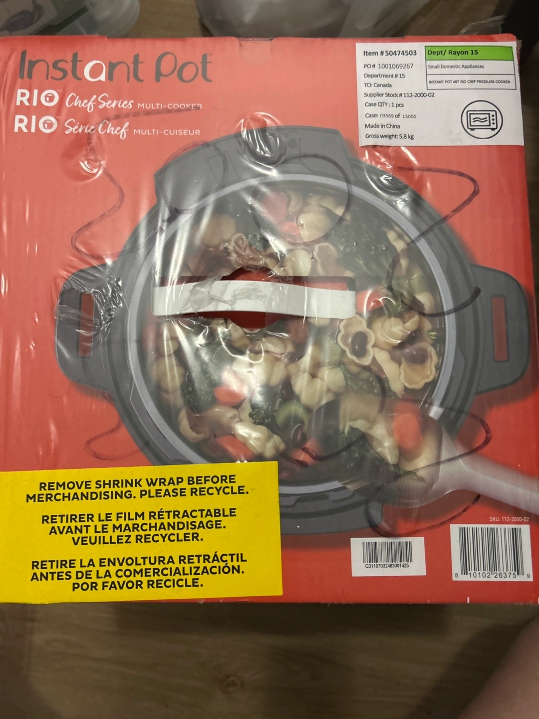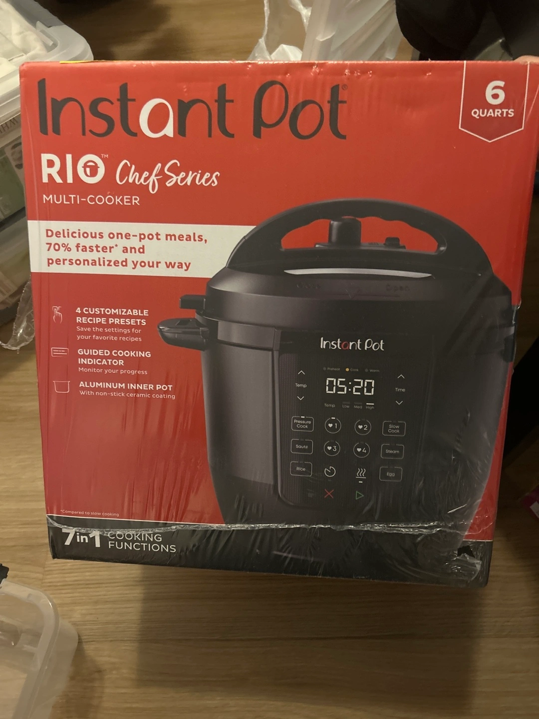 Brand new Instant Pot Rio Chef Series 6-quart multi-cooker. Seven cooking functions. Includes customizable recipe presets and guided cooking indicator. Aluminium inner pot with non-stick ceramic coating. Delicious one-pot meals, 70% faster.