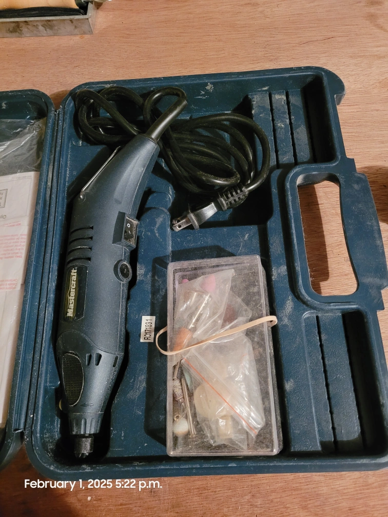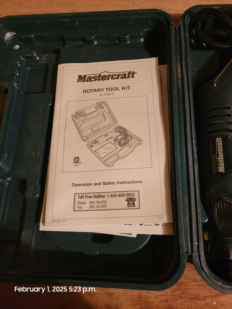 Used Mastercraft rotary tool kit. Includes rotary tool, various attachments, and carrying case. Instruction manual included. Great for crafts and small projects.