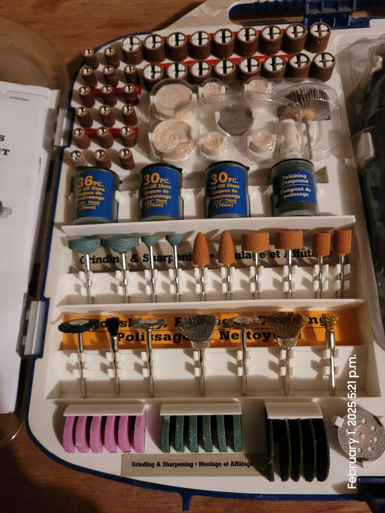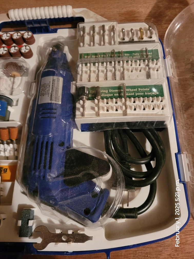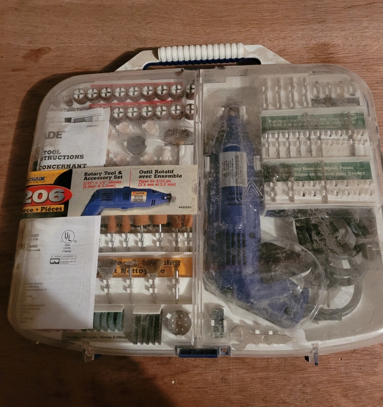 Rotary tool kit. Includes a variety of attachments in a plastic carrying case. Great for various crafting and hobby projects. Many different bits and attachments.