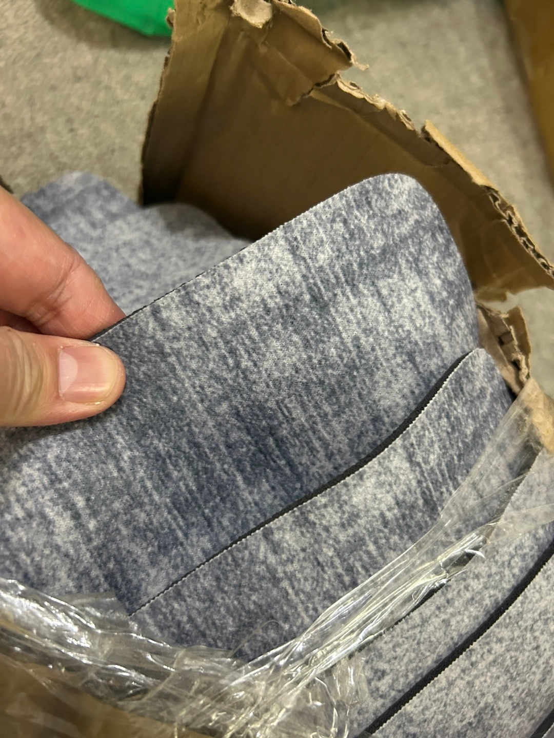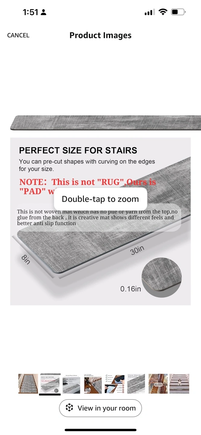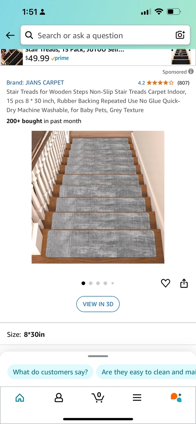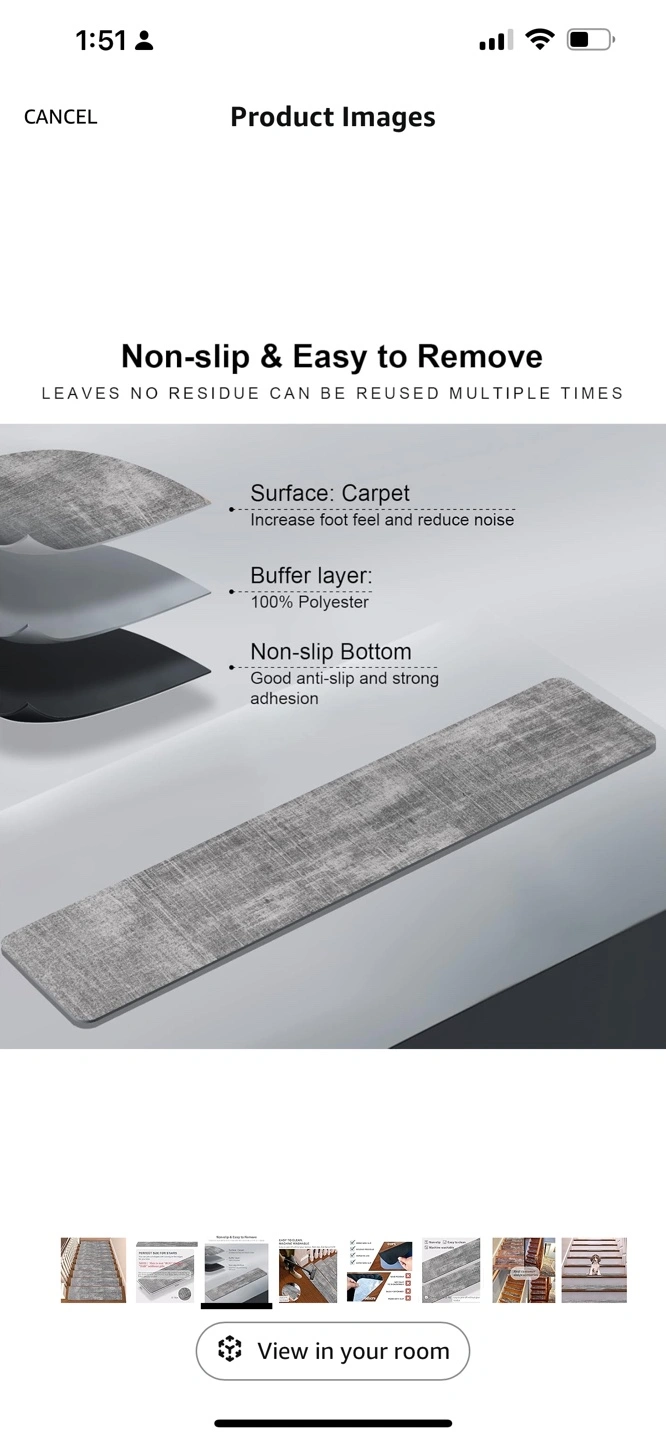 7615 stair treads, 8" x 30". Non-slip rubber backing. Easy to clean and reusable. Grey textured design. Perfect for wooden stairs. Suitable for indoor use and baby pets.