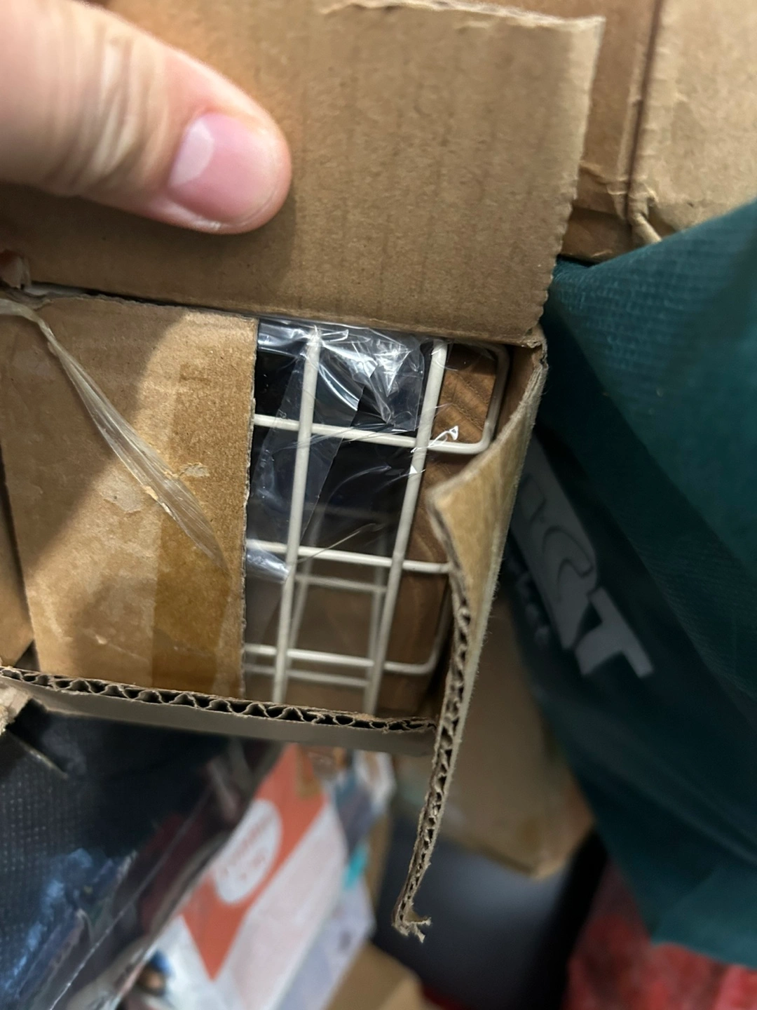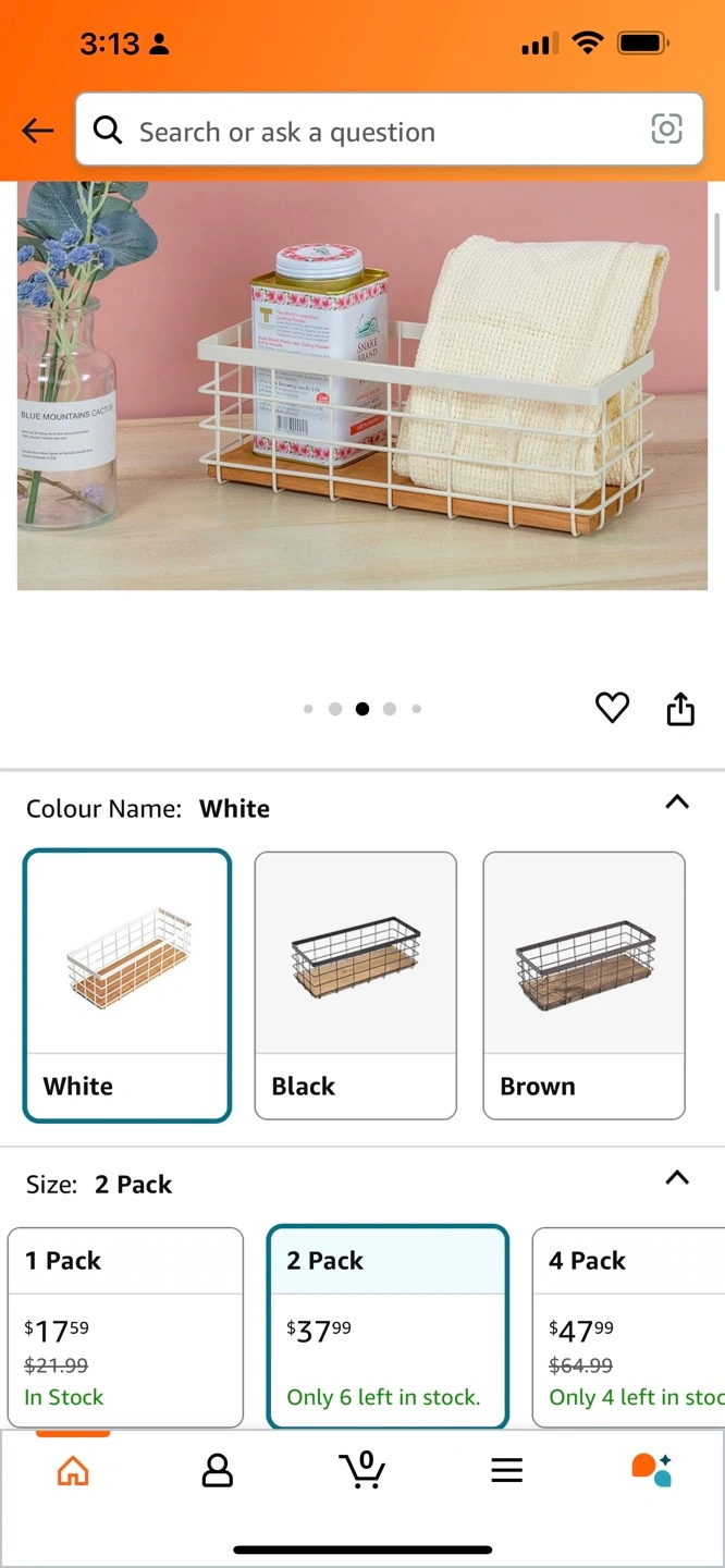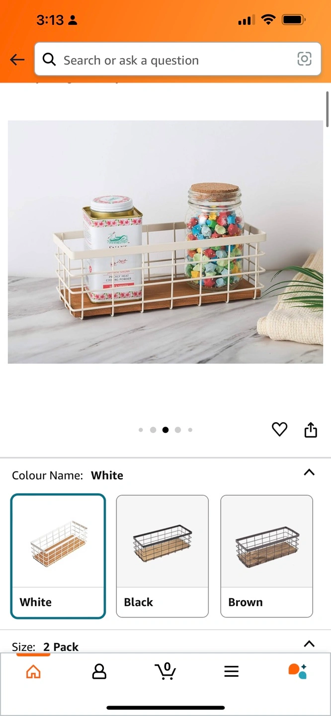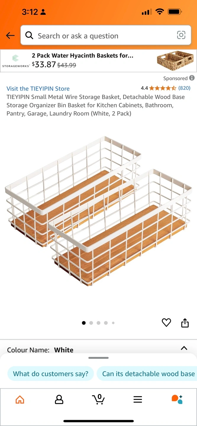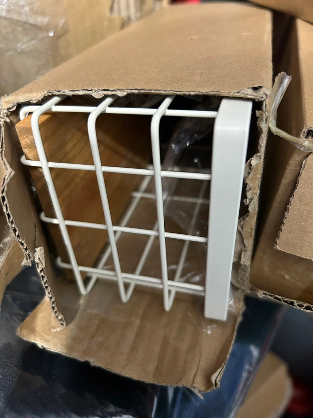 76Two white metal wire storage baskets. Each features a detachable wooden base. Great for kitchen, bathroom, pantry, garage, or laundry room. New in box.