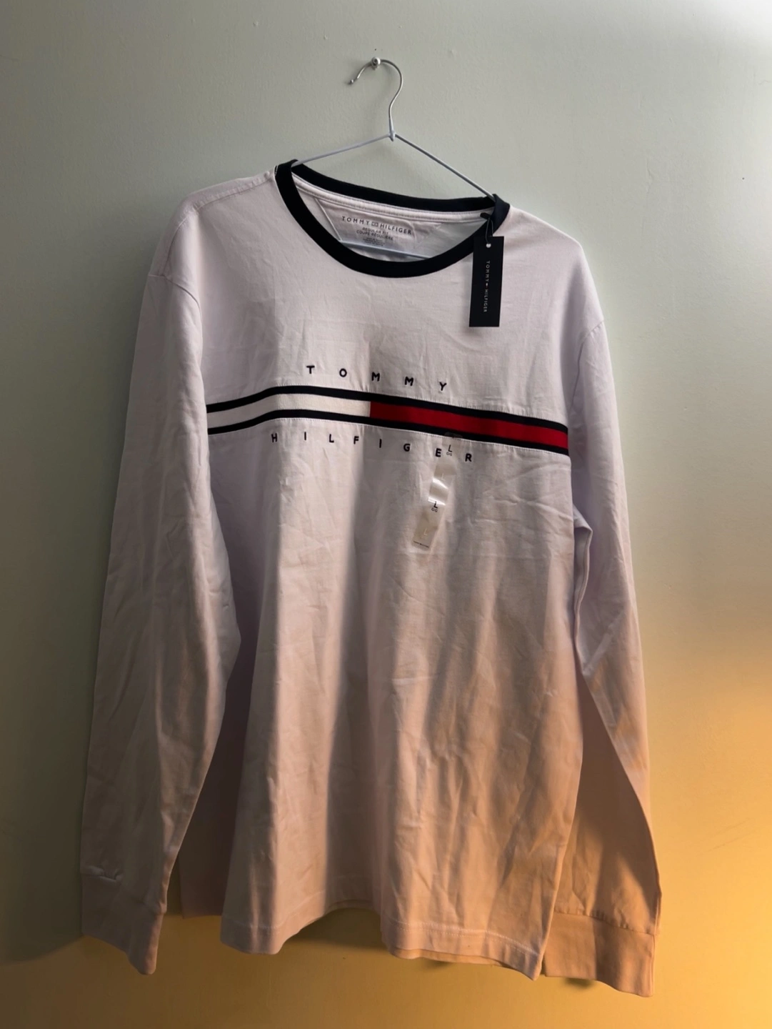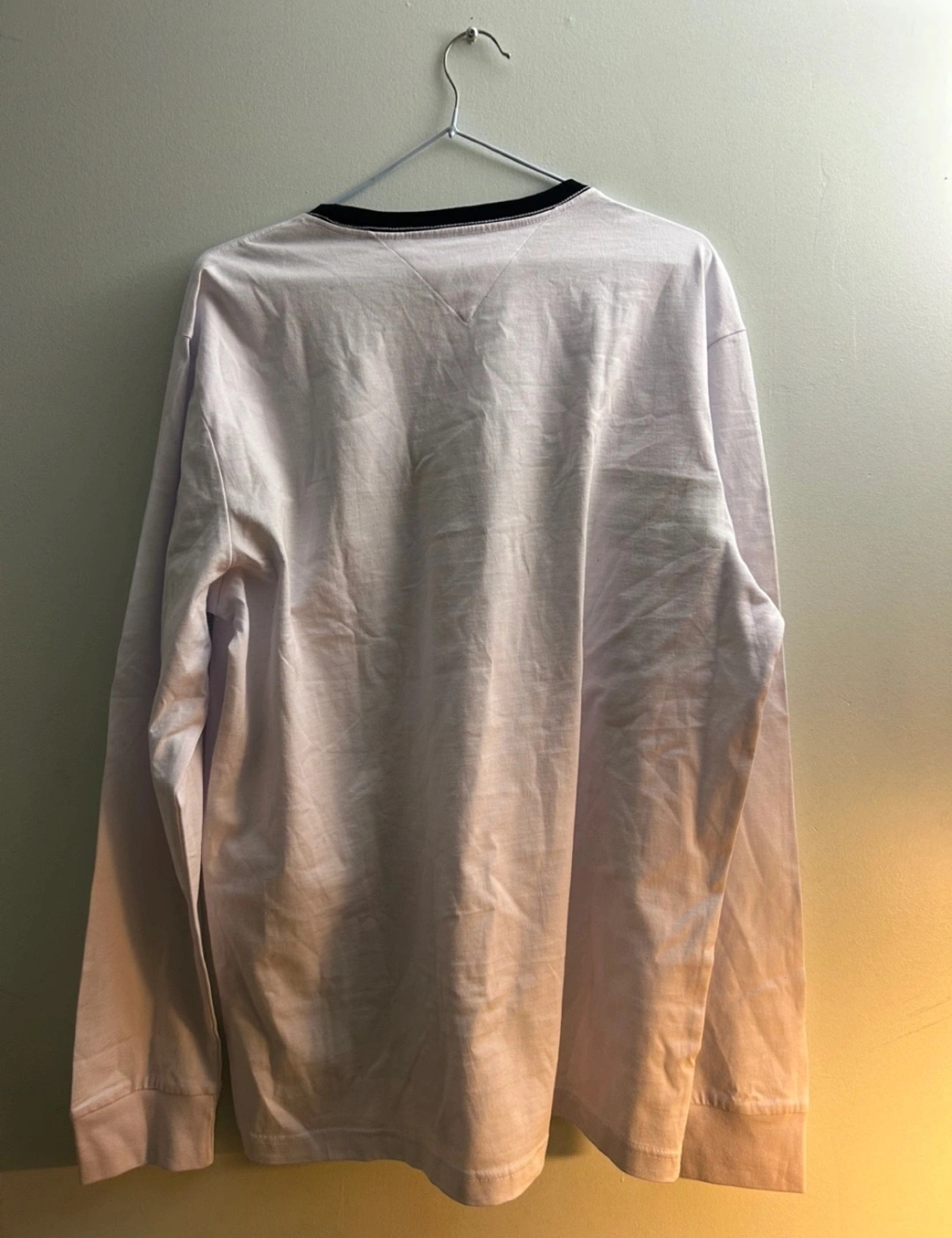 Brand New Men's long sleeve shirt. Light purple colour. Features a Tommy Hilfiger logo across the chest. Crew neck. Long sleeves.